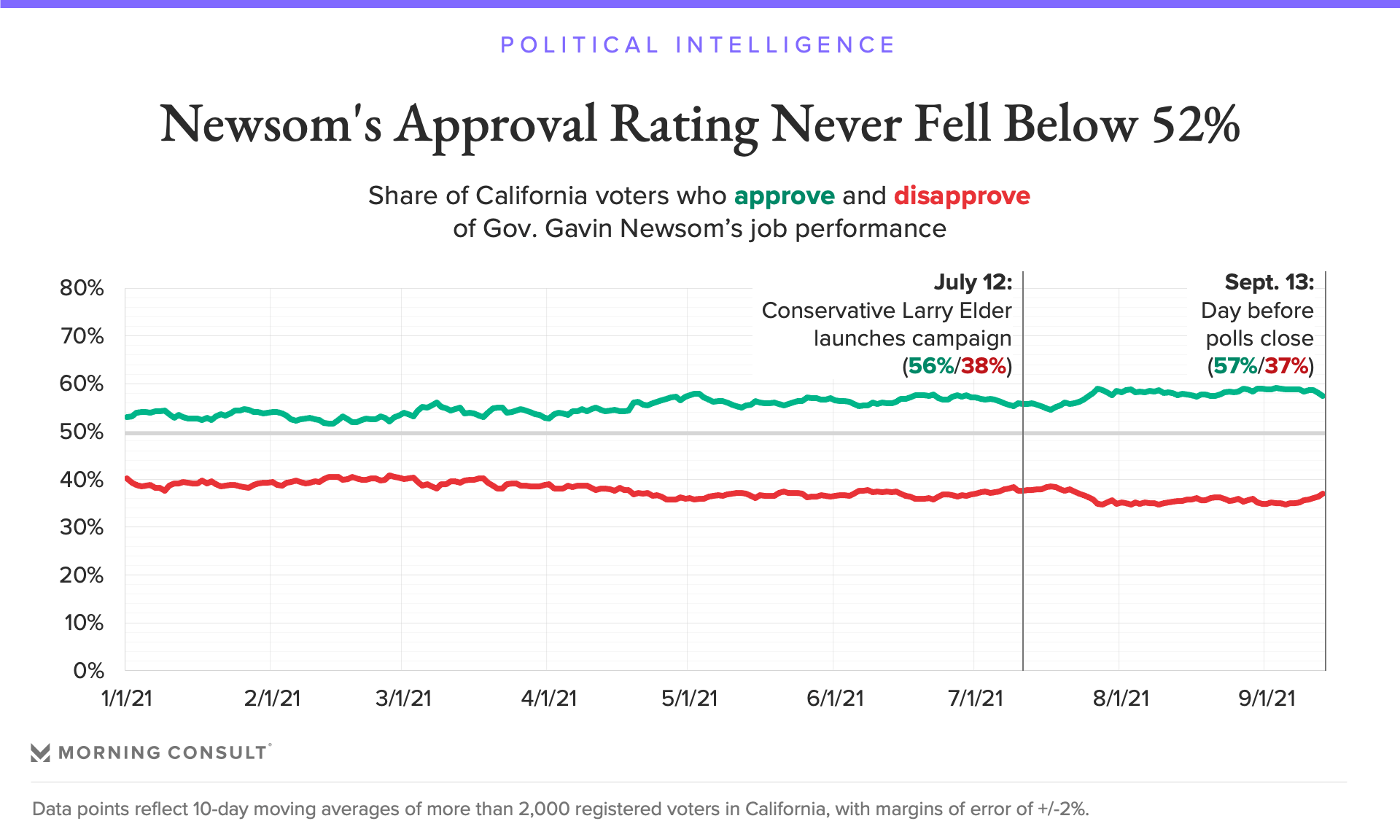 And on Tuesday, after a multimillion-dollar campaign over removing him from office, he easily defeated a recall effort that saw him grow increasingly popular over the course of the year, according to Morning Consult Political Intelligence tracking that casts doubt on the idea that he was ever truly in danger of losing the governor’s mansion.