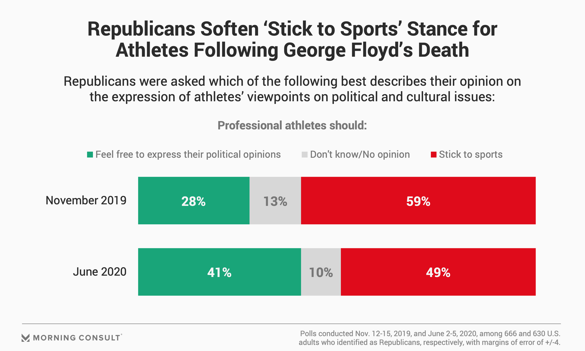 Hours after President Donald Trump resumed his crusade against NFL players demonstrating during the national anthem with a series of tweets Friday night, NFL Commissioner Roger Goodell said the league was “wrong” in its handling of players protesting police brutality in prior seasons. New research from Morning Consult reveals that the public has become more supportive of professional athletes’ speaking out about political and cultural issues in the wake of the alleged murder of George Floyd, led by a double-digit shift among Republicans.