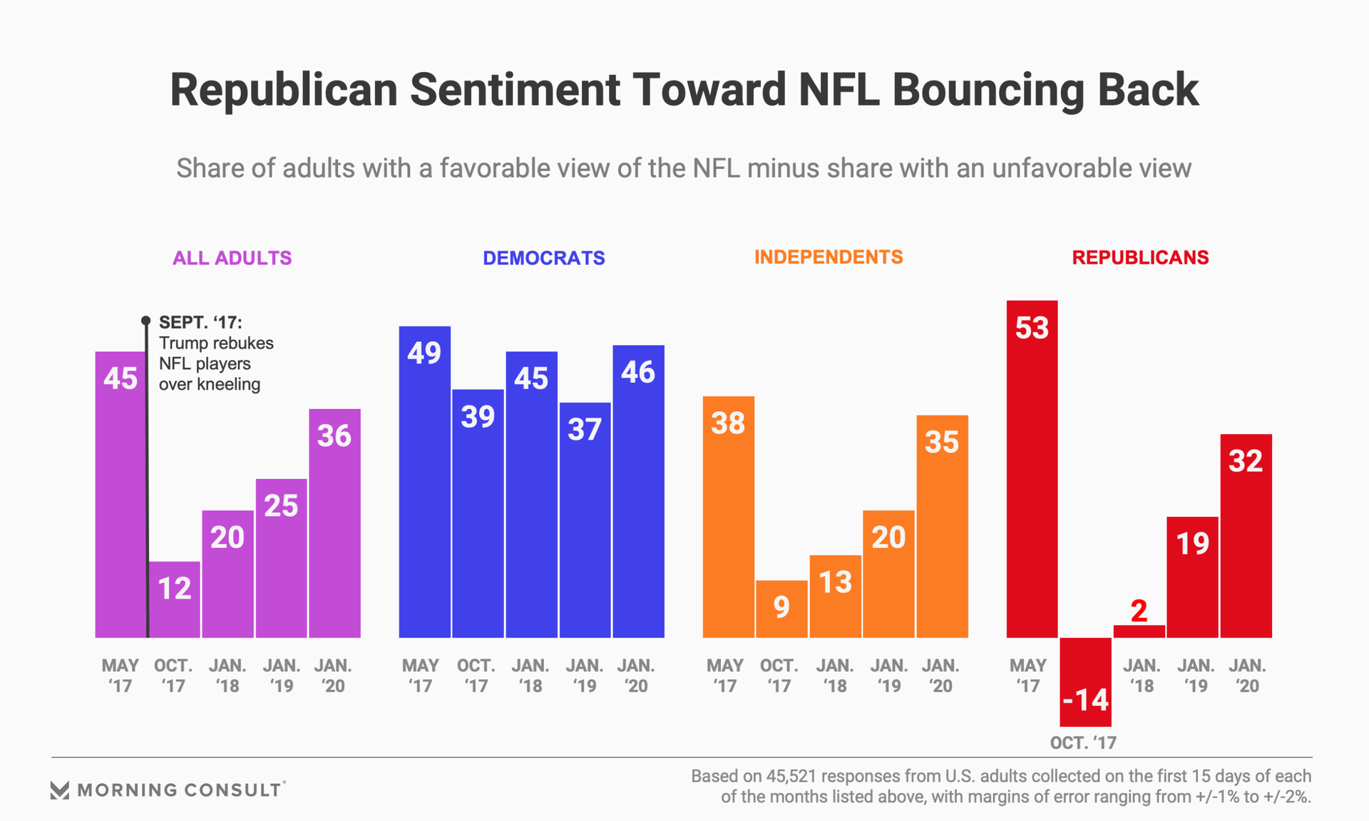 Heading into Super Bowl LIV, the league’s net favorability among U.S. adults is at its highest point since before the 2017 season, according to Morning Consult Brand Intelligence data, when the league found itself in the crosshairs of a culture war over players’ on-field protests against racial injustice in America. While the kneeling trend started during the 2016 season with then-San Francisco 49ers quarterback Colin Kaepernick, the controversy exploded when Trump rebuked players during a rally in Alabama prior to Week 3 of the 2017 season, a line of attack he would continue with 13 NFL-related tweets during the next week.