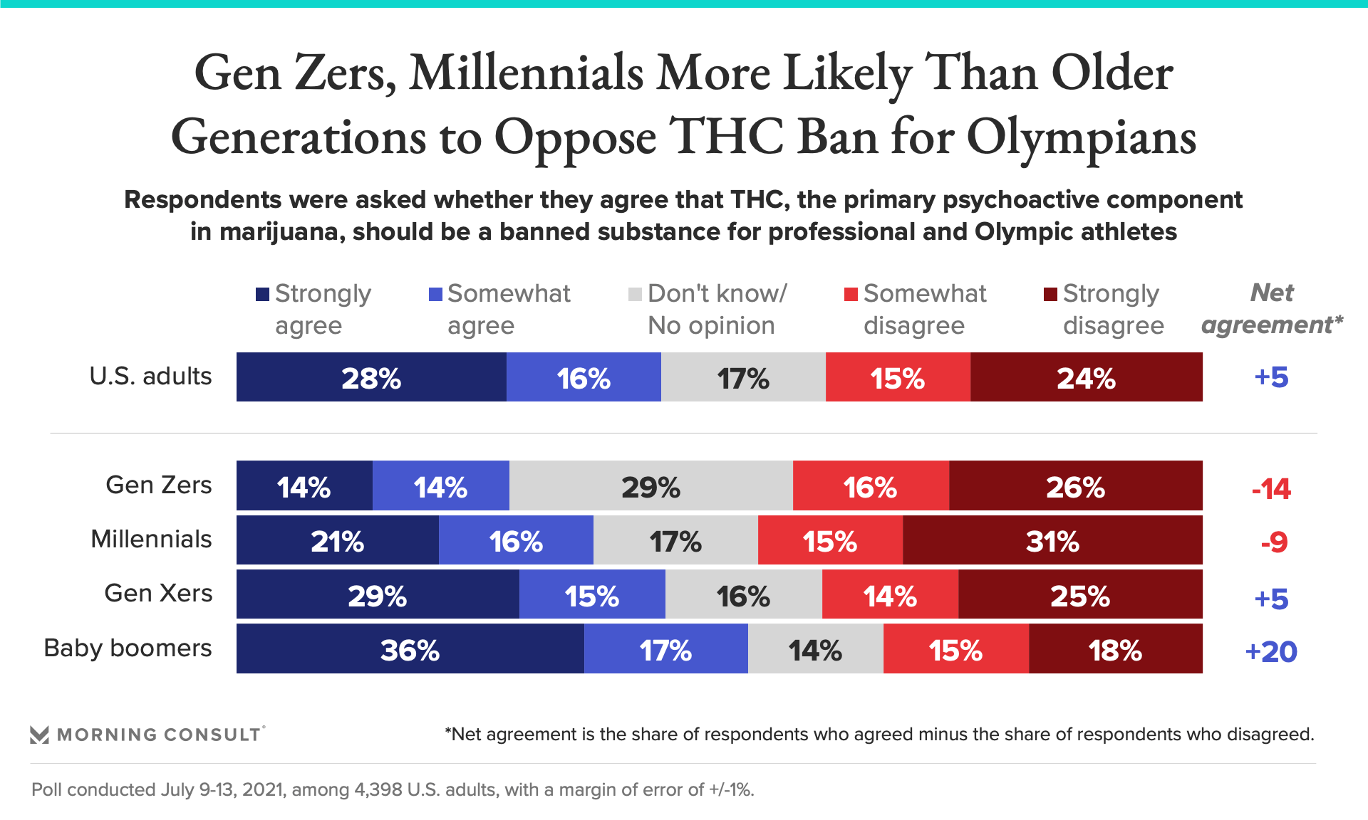Gen Zers (28%) and millennials (37%) were less likely than Gen Xers (44%) and baby boomers (53%) to agree with WADA’s THC ban.