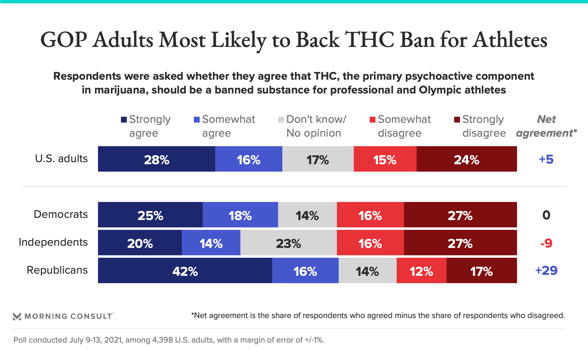 In a Morning Consult survey conducted after Richardson was suspended late last month by the U.S. Anti-Doping Agency and left off the U.S. Olympic team, 44 percent of U.S. adults agreed that THC should be a banned substance for Olympic and professional athletes. A slightly smaller share of respondents (39 percent) disagreed that marijuana should remain prohibited.