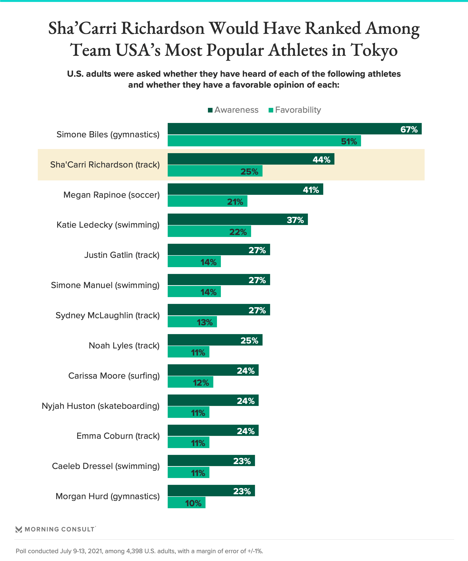 Richardson’s name recognition (44%) and favorability (25%) among U.S. adults following her suspension were higher than those of Megan Rapinoe and Katie Ledecky.