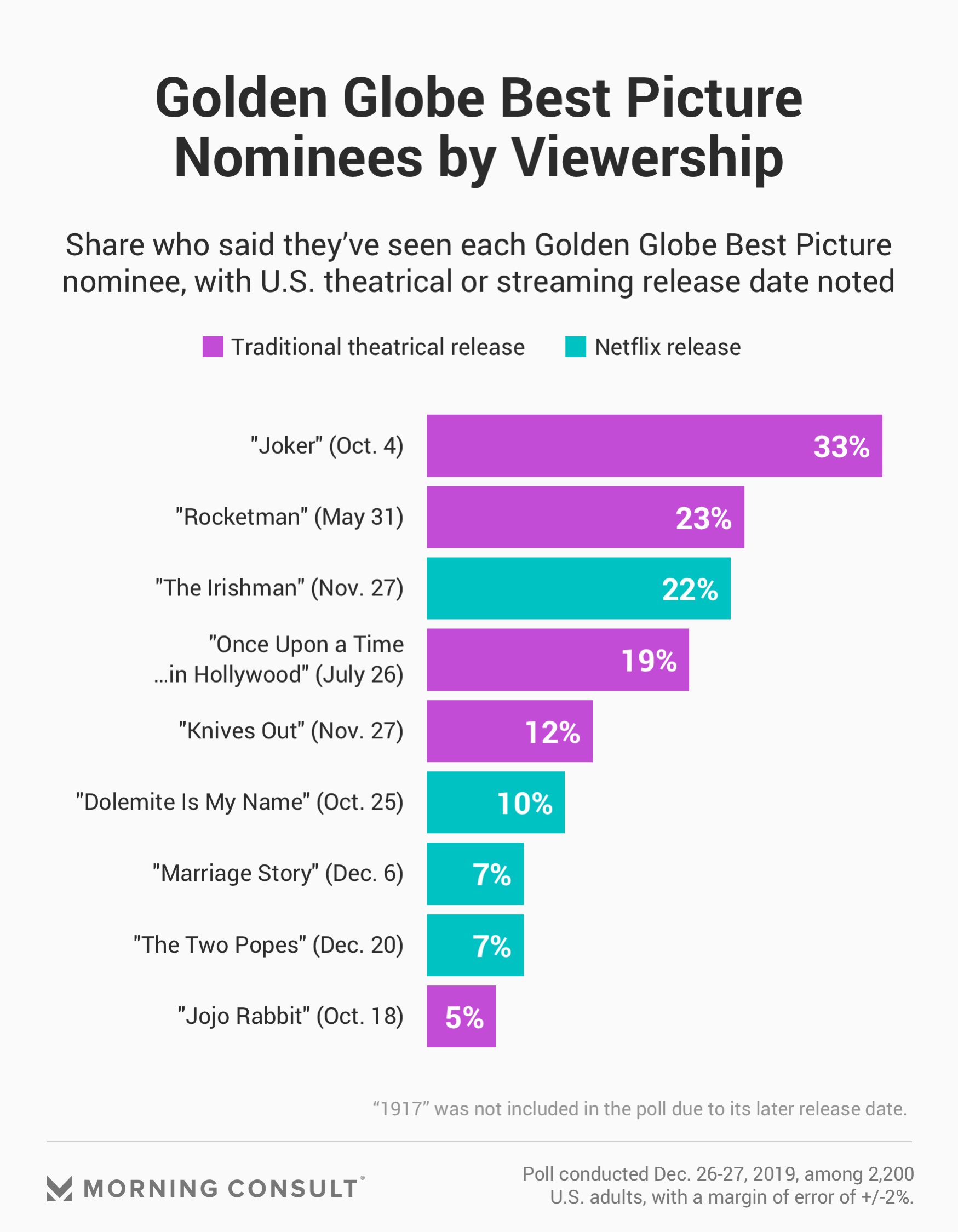 With the 77th Golden Globe Awards set to air this Sunday, audiences across the country are most likely to have seen “Joker” and “Rocketman,” according to new polling conducted throughout the holiday season, while smaller shares said they have seen Golden Globes contenders “Jojo Rabbit” and “Marriage Story.” And few are concerned with diversity in Hollywood, even as the Best Picture categories go another year with no female-helmed nominations.