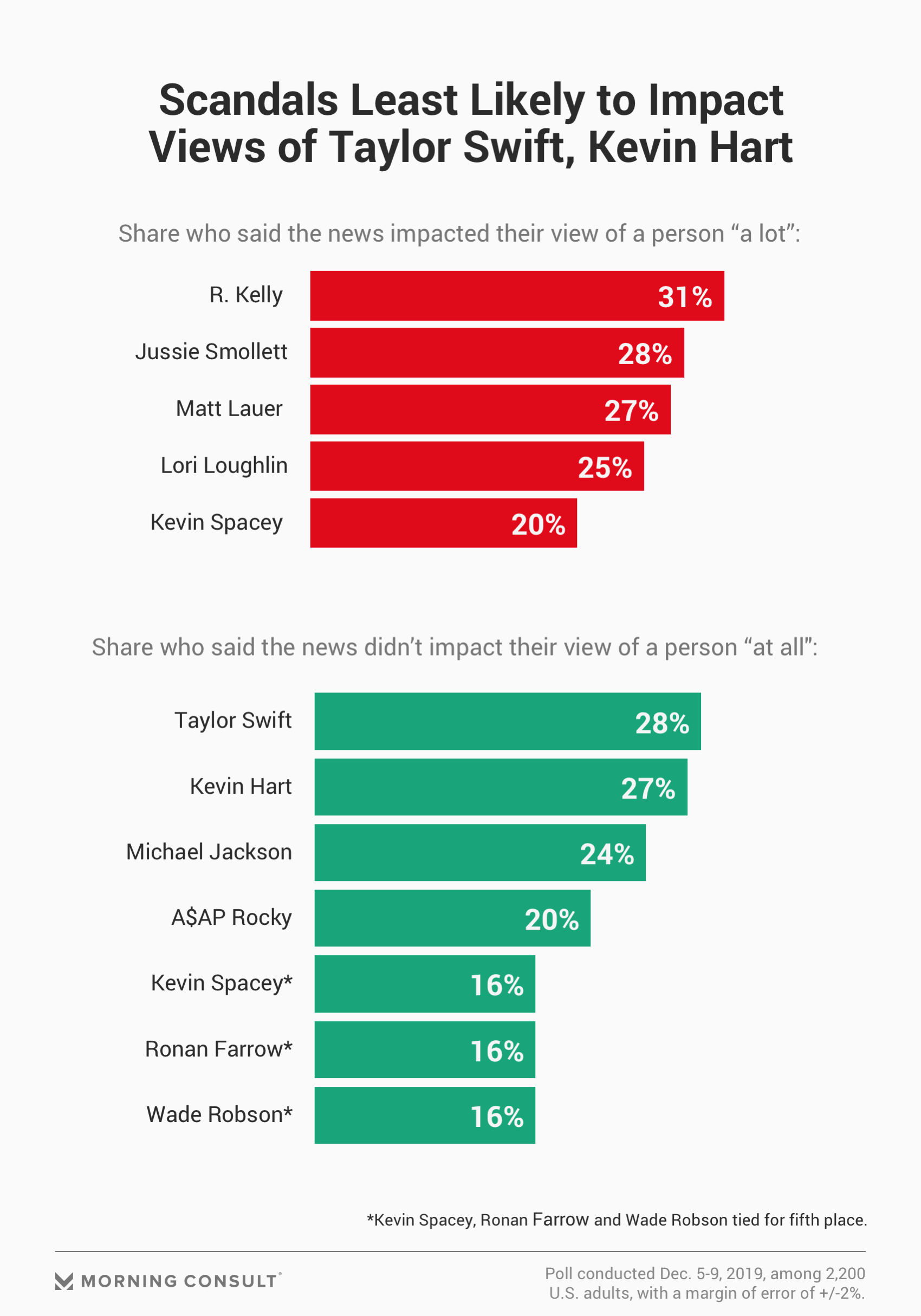 Among those figures involved in the polled stories, Kevin Hart, who stepped down as host of the 2019 Academy Awards after previous homophobic tweets were uncovered, had the highest net favorability -- the share who had a favorable view minus the share who had an unfavorable view -- at 46 points. Musicians Taylor Swift and the late Michael Jackson rounded out the top three with 30 points and 12 points respectively.