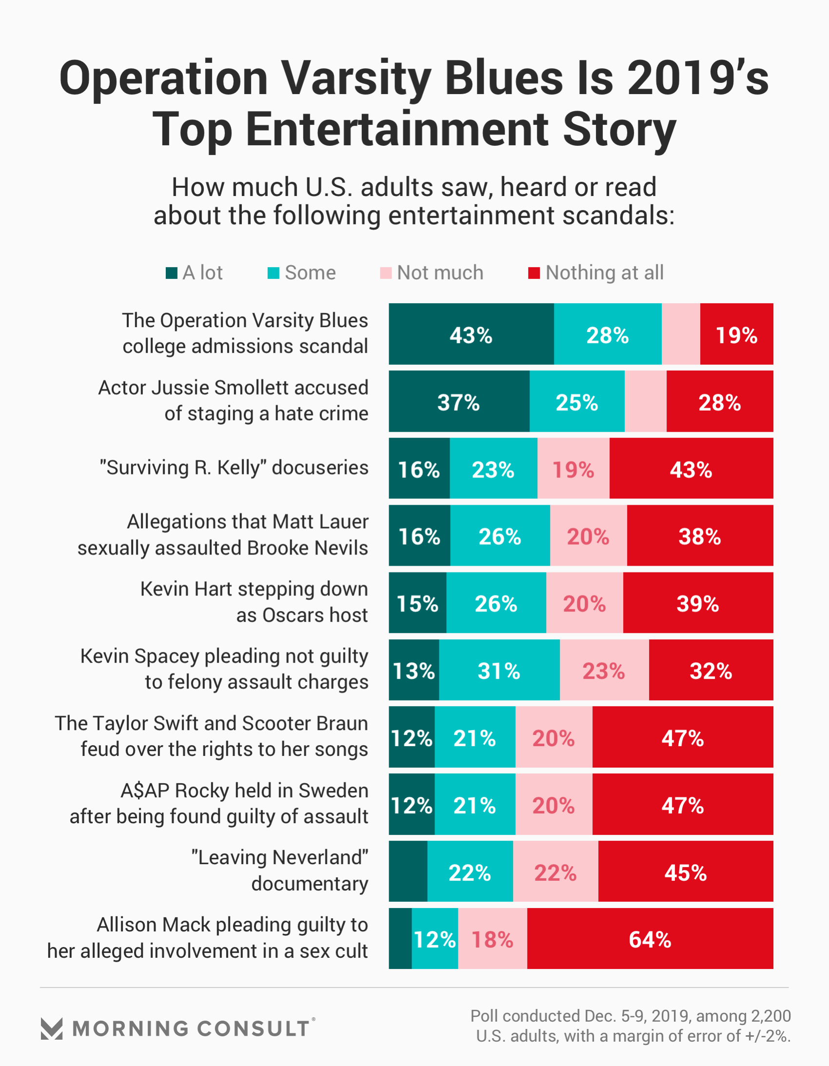 A Dec. 5-9 Morning Consult/The Hollywood Reporter poll asked 2,200 U.S. adults how much they had seen, read or heard about a number of entertainment news stories from 2019. The most pervasive of the list was the “Operation Varsity Blues” college admissions investigation that resulted in the arrests of actresses Felicity Huffman and Lori Loughlin: Forty-three percent of respondents said they had heard “a lot” about the scandal, which involved efforts to influence college admissions through bribery and falsified test scores. Thirty-seven percent said they saw, read or heard a lot about actor Jussie Smollett being accused by the police of paying two men to stage an attack on him in which they yelled racist and homophobic slurs and tied a rope around his neck.
