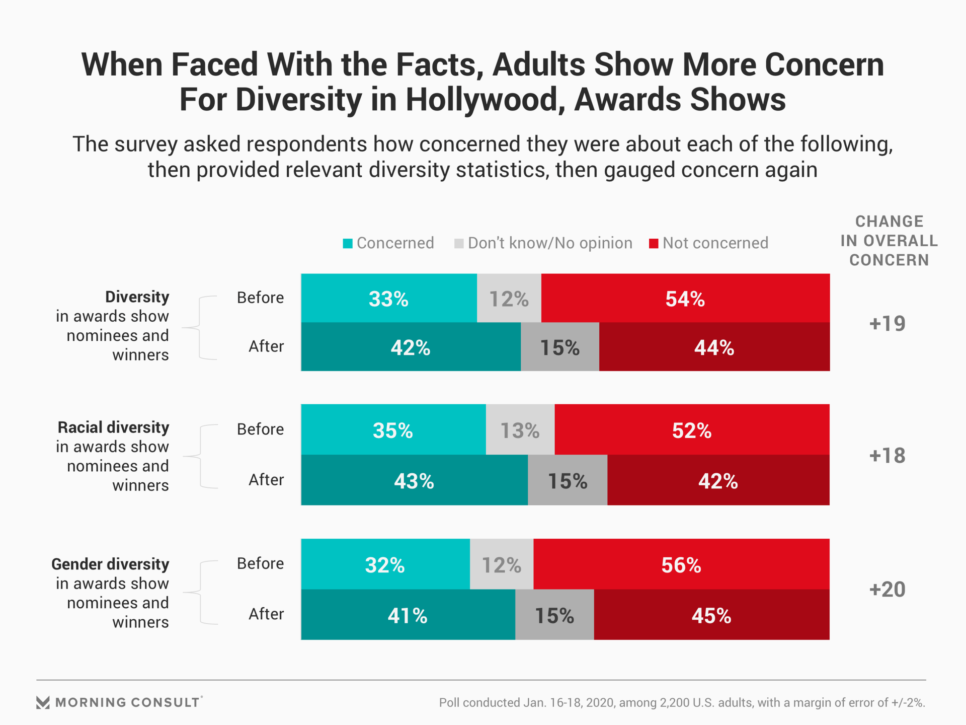 A Jan. 16-18 Morning Consult/The Hollywood Reporter survey asked 2,200 U.S. adults about their concern regarding diversity in the entertainment industry. A slim majority -- 53 percent -- said they were not concerned about the issue, while 54 percent said they were not worried about diversity among awards show nominees and winners.