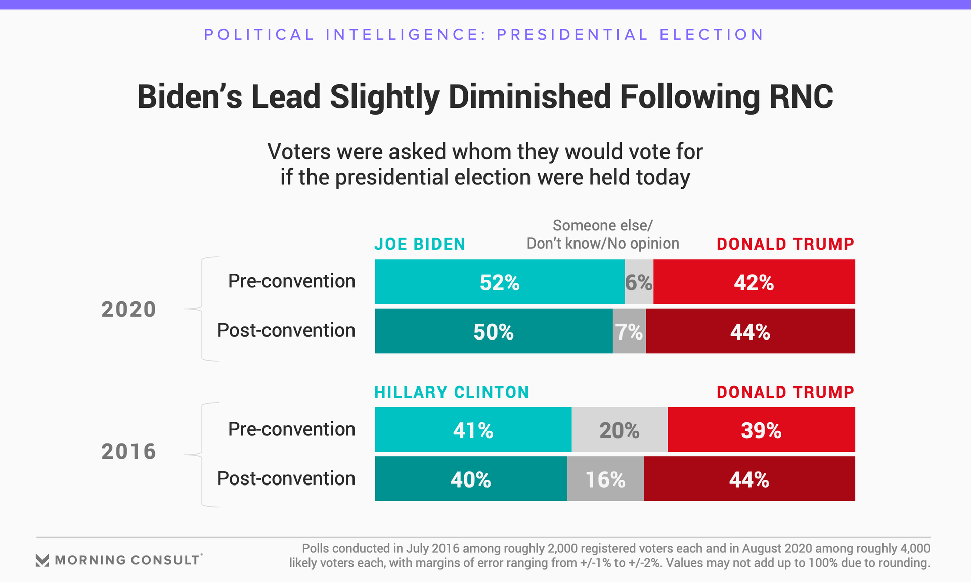 The movement stands in contrast to voters’ reaction to the Democratic National Convention held the previous week, when Biden’s lead over Trump went statistically unchanged, and harks back to the bump in support that Trump saw after the 2016 Republican National Convention. However, due to a smaller share of undecided voters, Biden, who continues to have about half of the electorate’s support, remains in a significantly stronger position than Democratic nominee Hillary Clinton was four years ago.