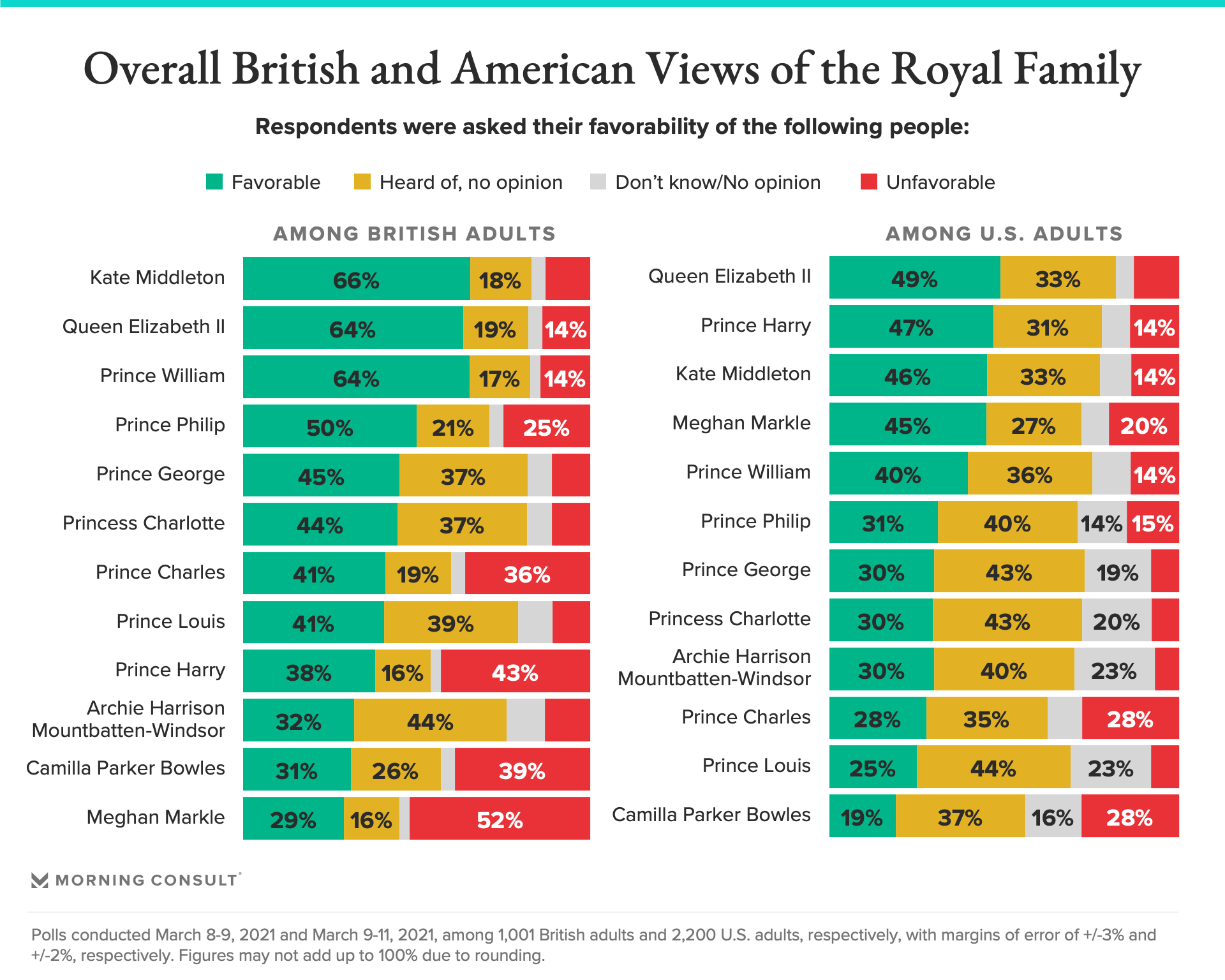 Among U.S. adults, which include those who did not see the CBS interview, Queen Elizabeth II (49%) remained the most popular royal, while Kate Middleton topped the list for British respondents (66%).