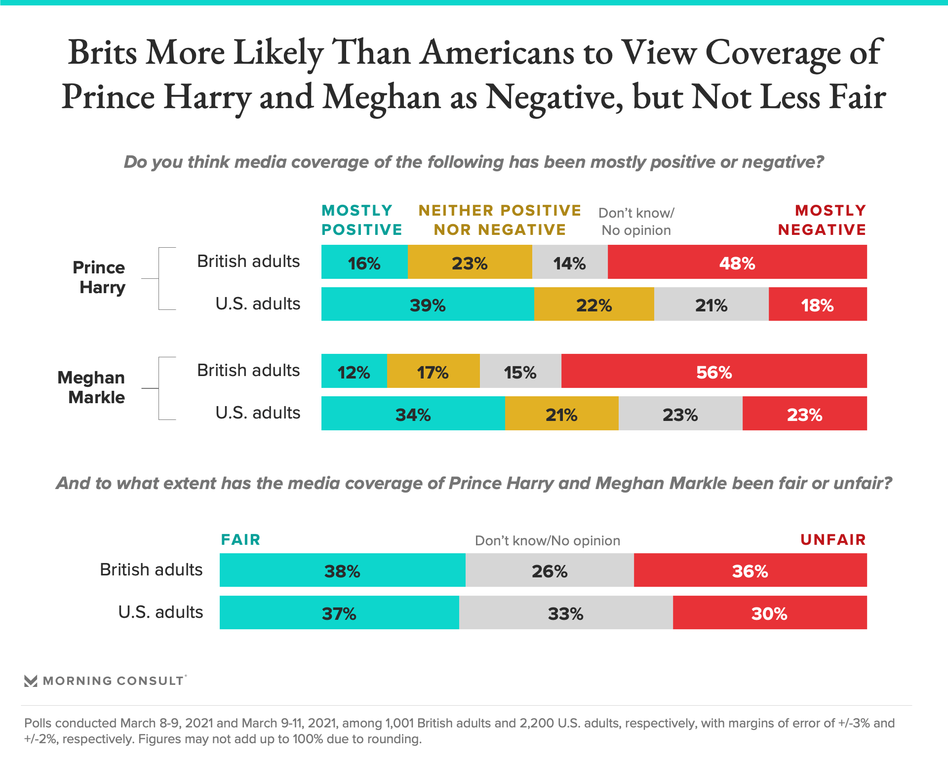 Forty-eight percent of British respondents said media coverage of Prince Harry has been mostly negative, compared to 18 percent of U.S. respondents, while 56 percent of British respondents and 23 percent of U.S. respondents said the same about coverage related to Meghan.
