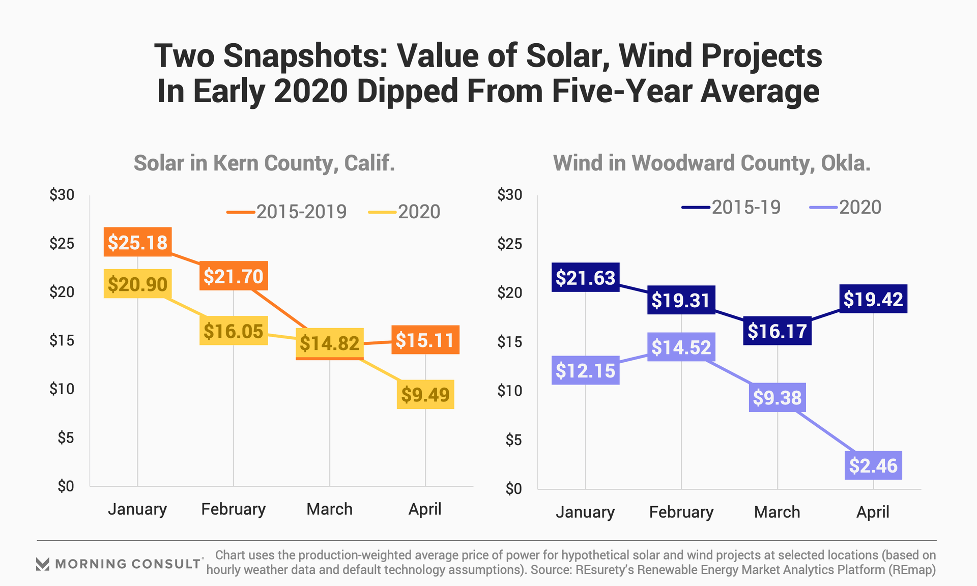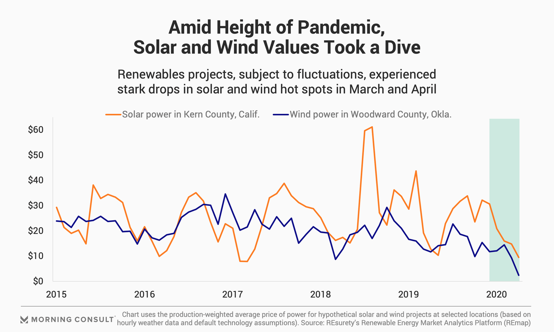 March -- when most of the United States went into lockdown over the threat of the coronavirus -- served as an inflection point for solar in Kern County, Calif., and for wind in Woodward County, Okla. Solar prices dipped to $9.49 per MWh for solar and to $2.46 for wind in April at the two sites, which were chosen because of their high penetration of solar and wind installations, respectively.