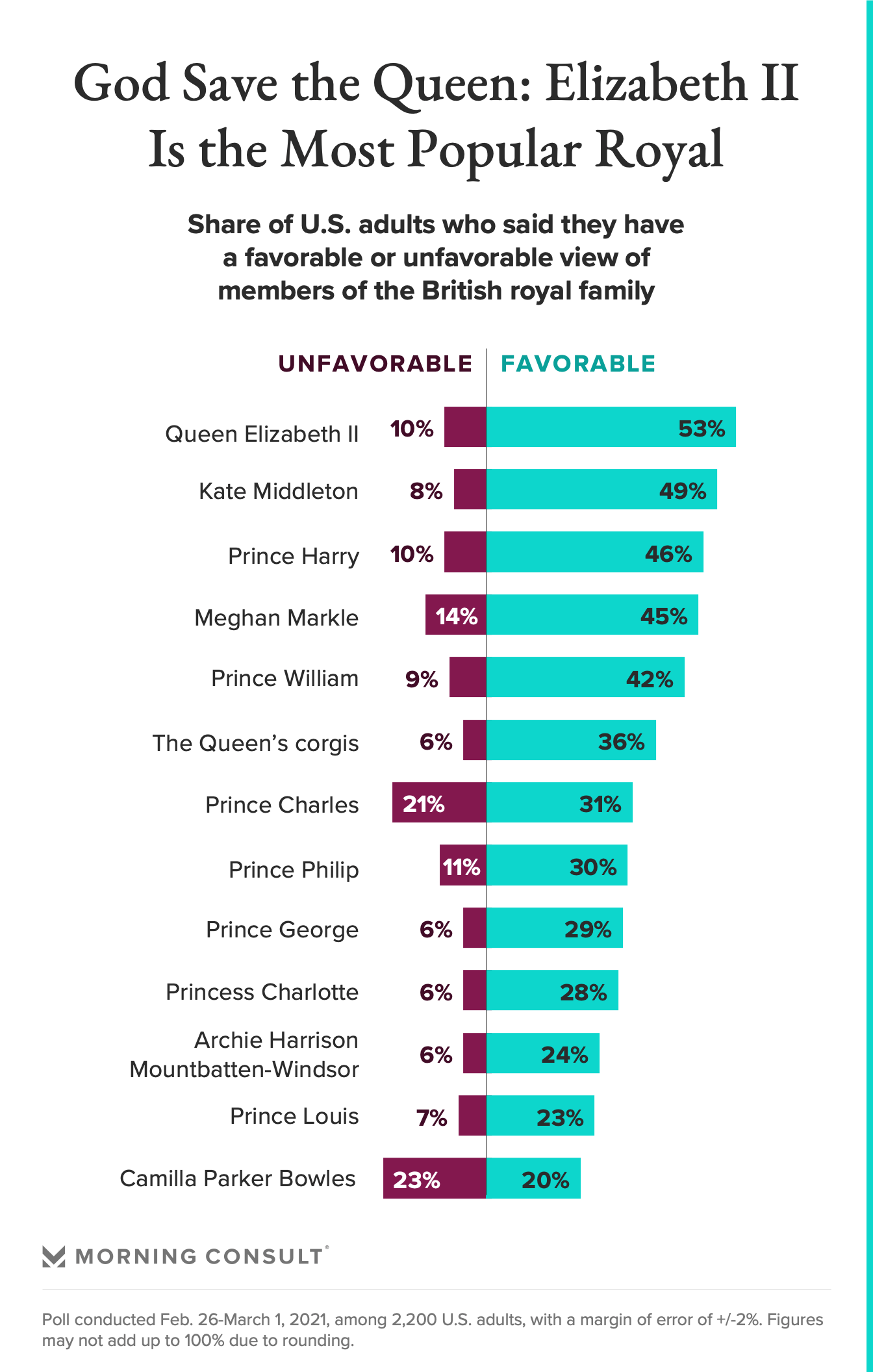 At 53%, Queen Elizabeth II has the highest favorability rating among members of the royal family. Kate Middleton (49%) ranked slightly higher than Meghan Markle (45%), while Prince Harry (46%) ranked just above Prince William (42%) in the U.S. survey.