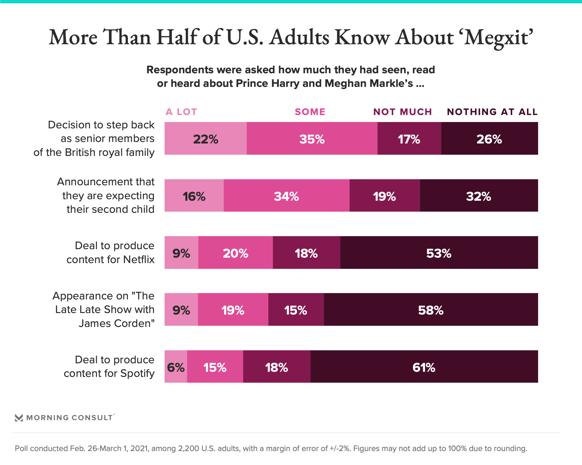 57% said they had seen, read or heard “some” or “a lot” about the Duke and Duchess of Sussex’s decision to step back as senior members of the British royal family, roughly twice the share that said the same of the couple’s Netflix deal (29%).