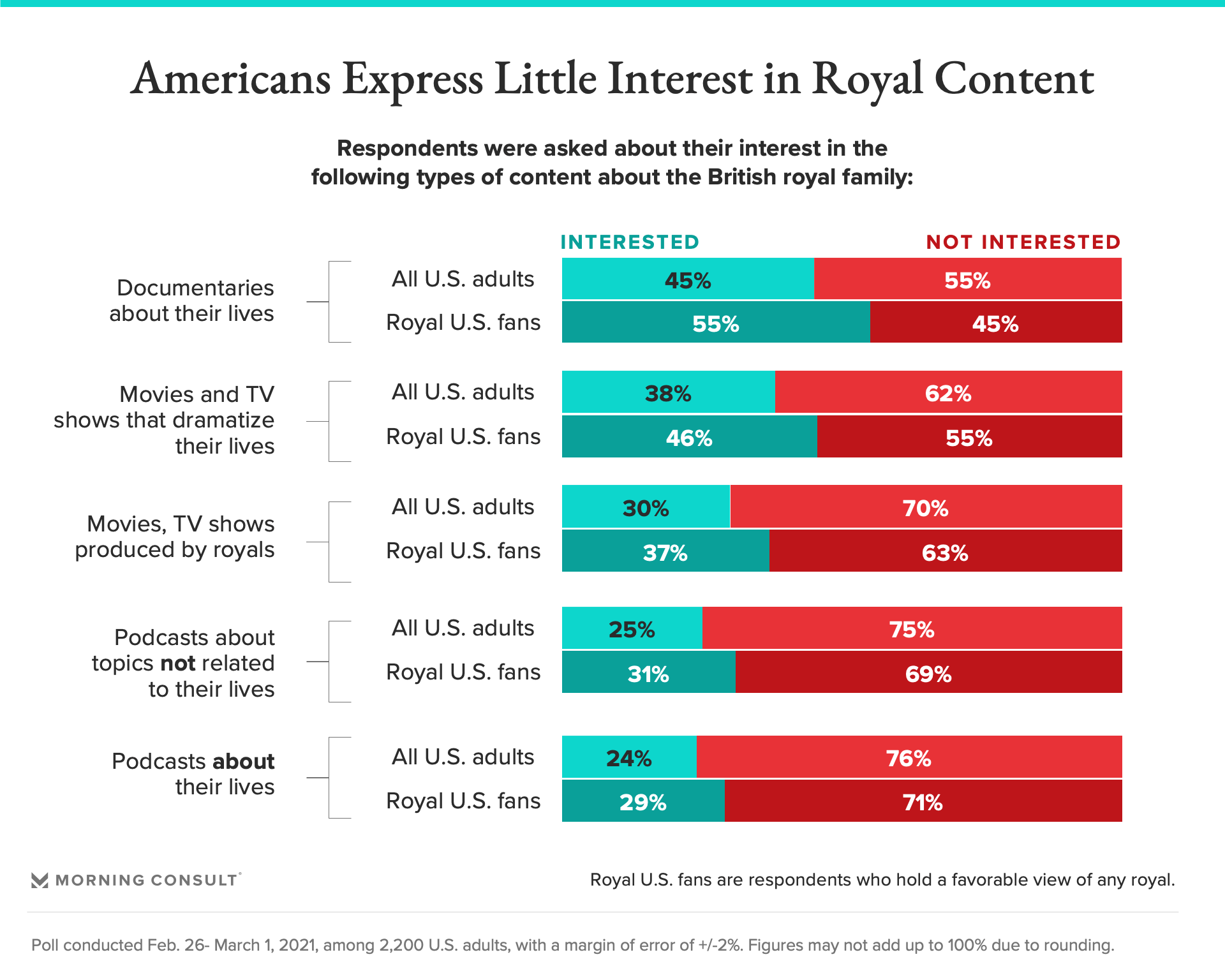 Now, ahead of Harry and Meghan’s sit-down CBS interview with Oprah Winfrey airing on Sunday, their first joint public appearance since their detachment from Buckingham Palace was made permanent last month, Morning Consult polling offers insights into U.S. adults’ feelings about the British royal family, as well as their appetite for content about and produced by the royals.