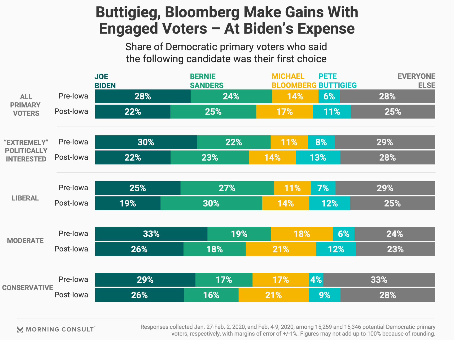Among liberal, moderate and conservative Democratic voters, Buttigieg effectively doubled his support, while Bloomberg saw more modest gains. Sanders solidified his support among the party’s most liberal voters, while Bloomberg improved his standing among moderates and conservatives, though he’s still behind Biden.