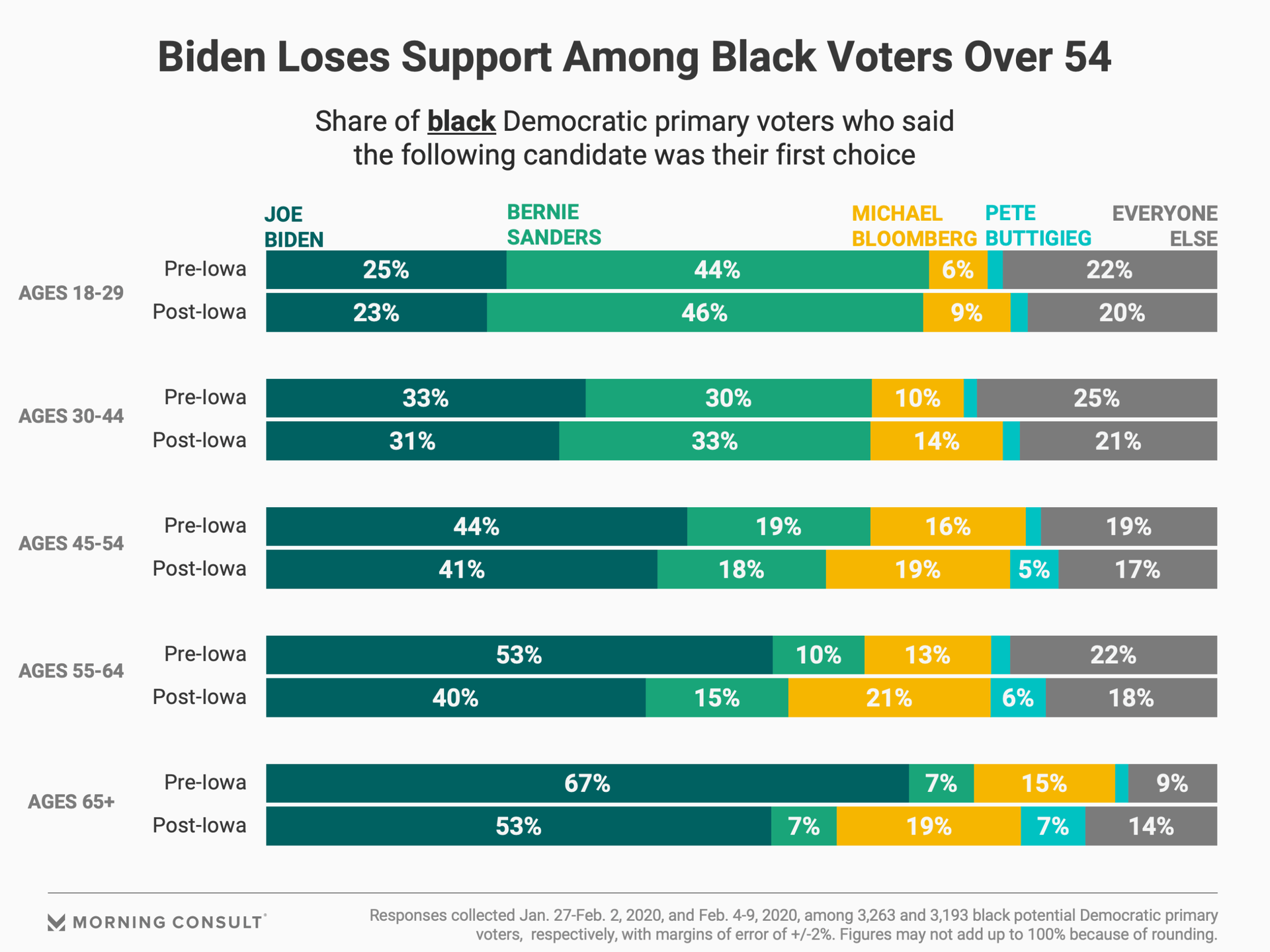 Biden’s rock-solid support with black voters has been a longstanding feature of his party’s race for president, but his performance in Iowa appears to have shaken his standing with the pivotal Democratic constituency. His first-choice status dropped across the board with African Americans, including a 13-point drop among black voters ages 55-64 and a 14-point drop among the oldest black voters, ages 65 and older.