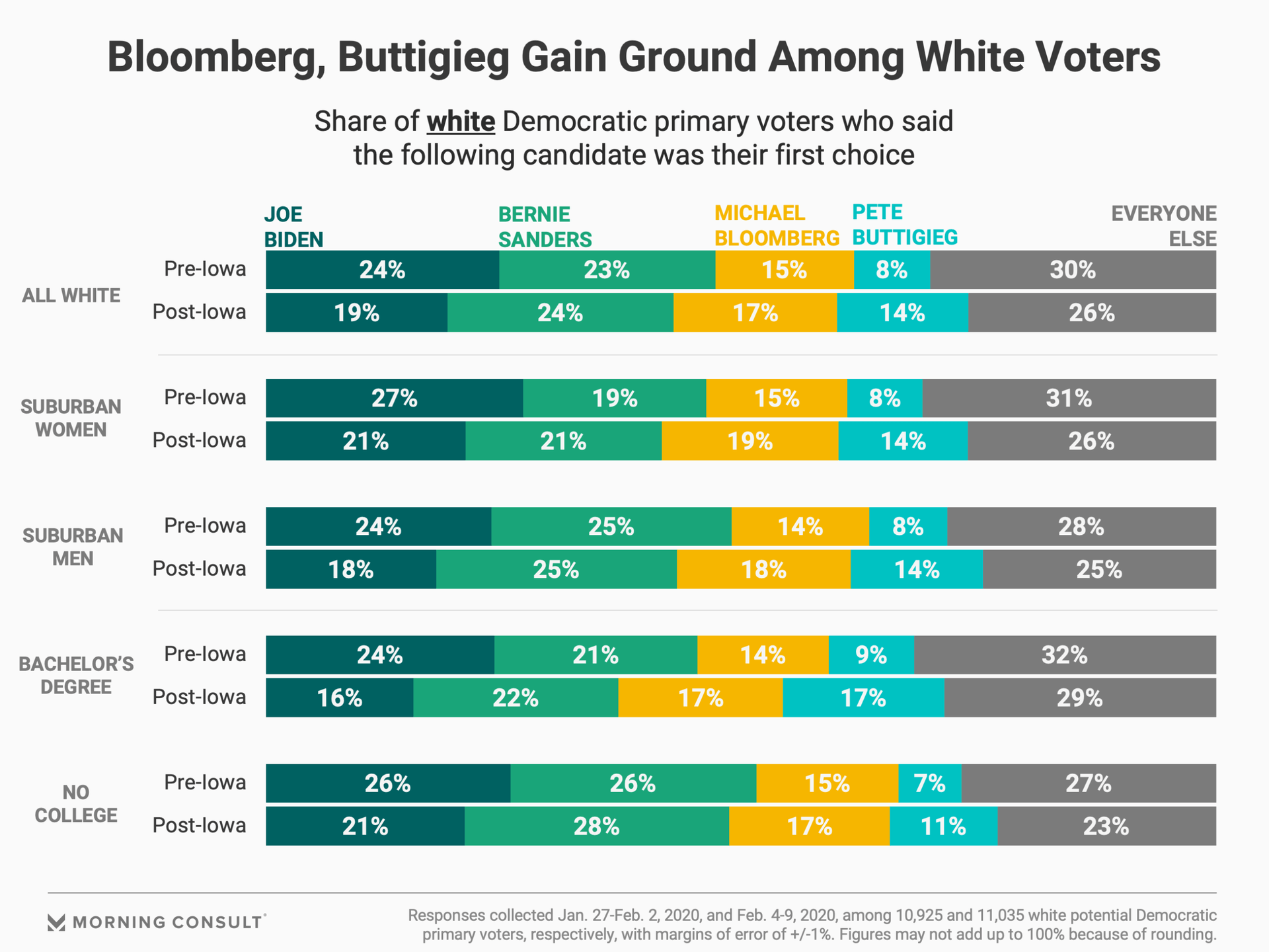Buttigieg saw the biggest bounce among white voters (up 6 points, to 14 percent), including an 8-point improvement among those who have a bachelor’s degree -- tying Bloomberg at 17 percent -- and a 6-point improvement among suburban women, placing him behind Bloomberg, who has courted the group for years while advocating for gun control, and statistically tying Warren.