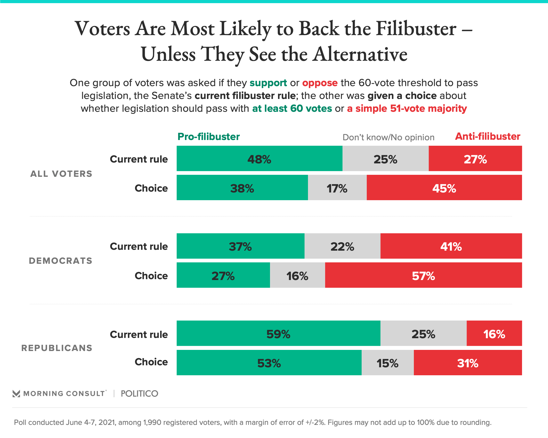 The June 4-7 poll split its sample of respondents into two groups, and asked each set of voters about the filibuster in different ways. Half of the poll’s 1,990 respondents were asked whether they support the Senate’s current rule that 60 senators have to agree to allow a final vote on a piece of legislation. The other half was asked whether bills should have 51 or 60 out of 100 votes in order to pass.