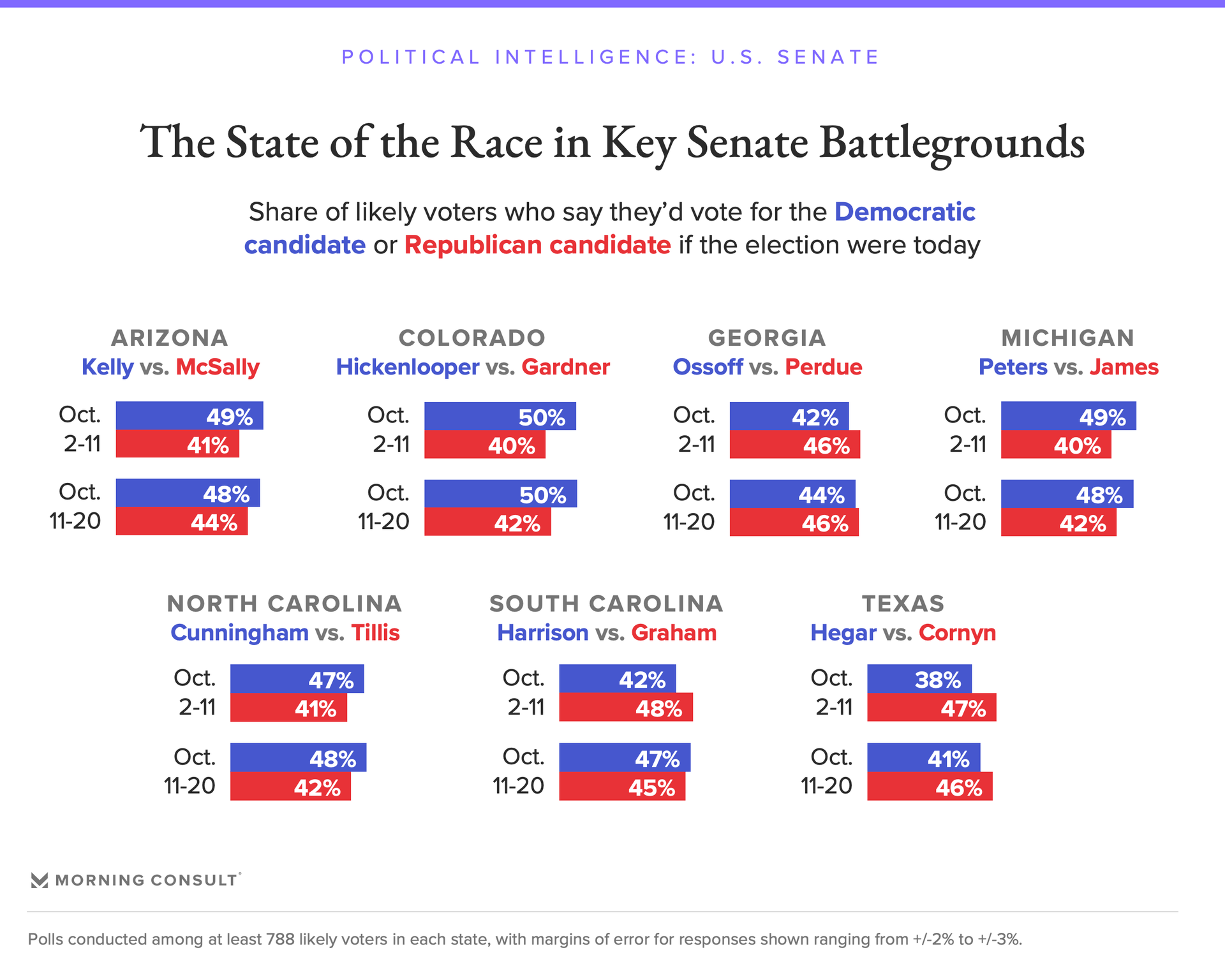 Democrats enter the final stretch of the campaign with leads in Arizona, Colorado, Michigan and North Carolina, according to the latest Morning Consult Political Intelligence tracking, while Democrat Jaime Harrison has taken a narrow lead over Republican Sen. Lindsey Graham in South Carolina. In Texas, GOP Sen. John Cornyn still leads Democrat MJ Hegar, though the senior senator’s edge in the contest has been almost cut in half since earlier this month.