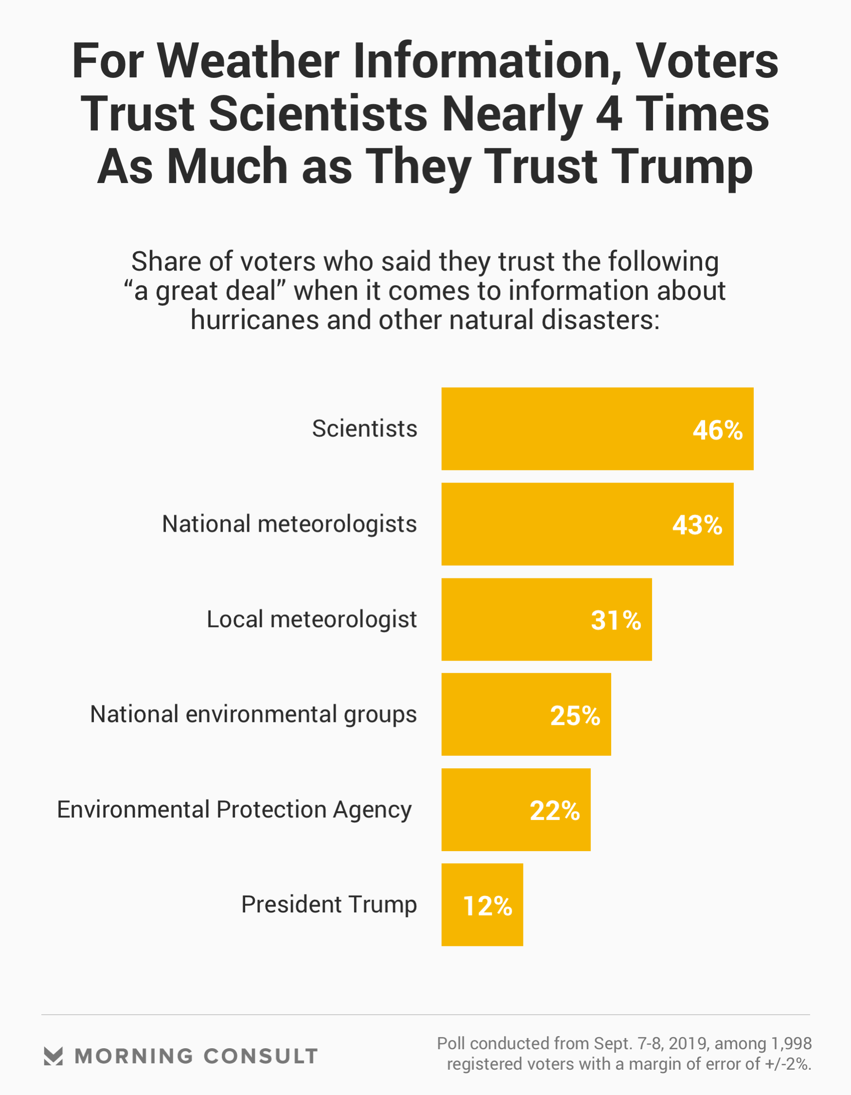 While the Morning Consult/Politico poll clearly shows the electorate’s trust in Trump on weather-related matters is a partisan issue, voters appear more likely to place their faith in nonpartisan sources such as scientists and national meteorologists to provide reliable information on natural disasters.