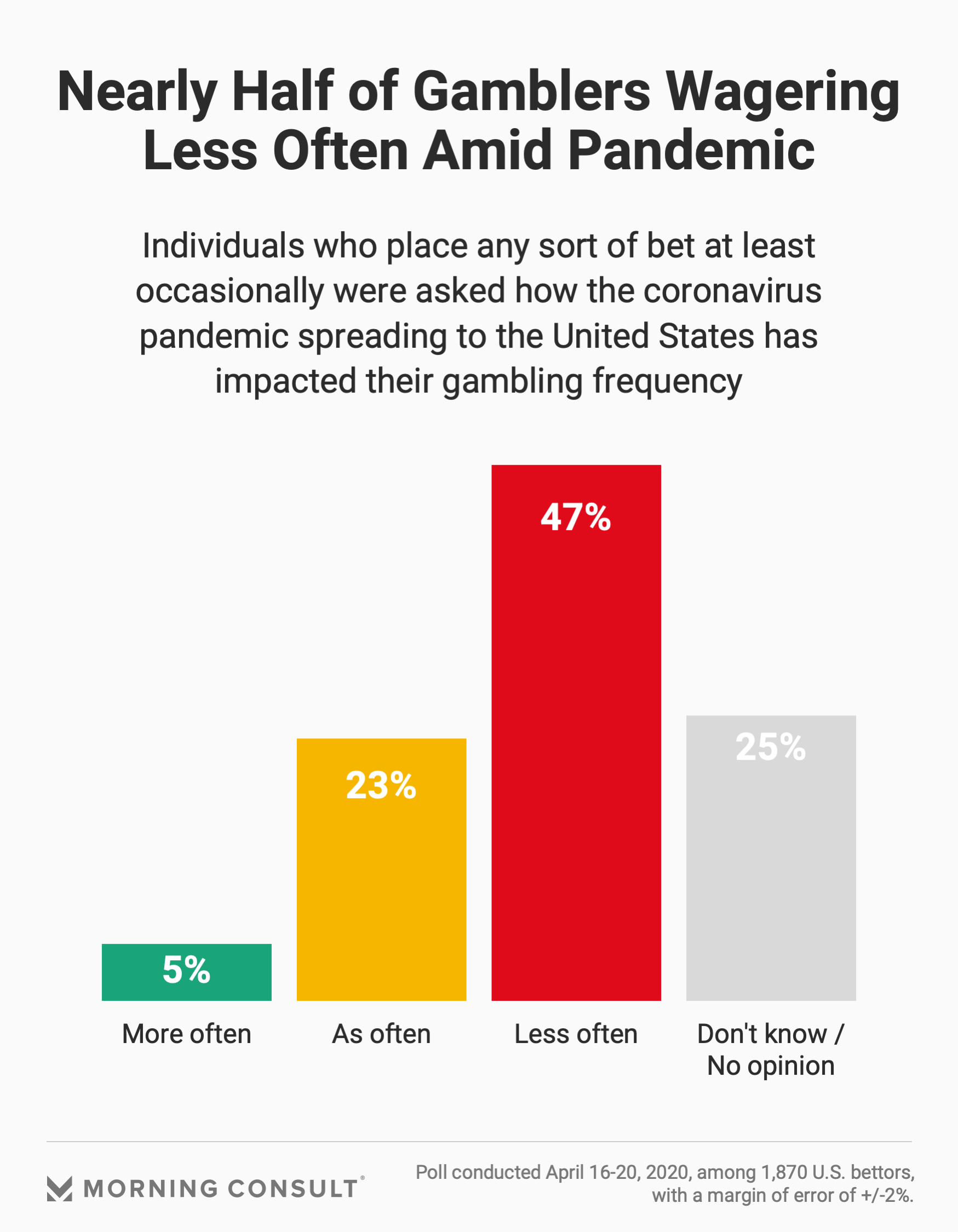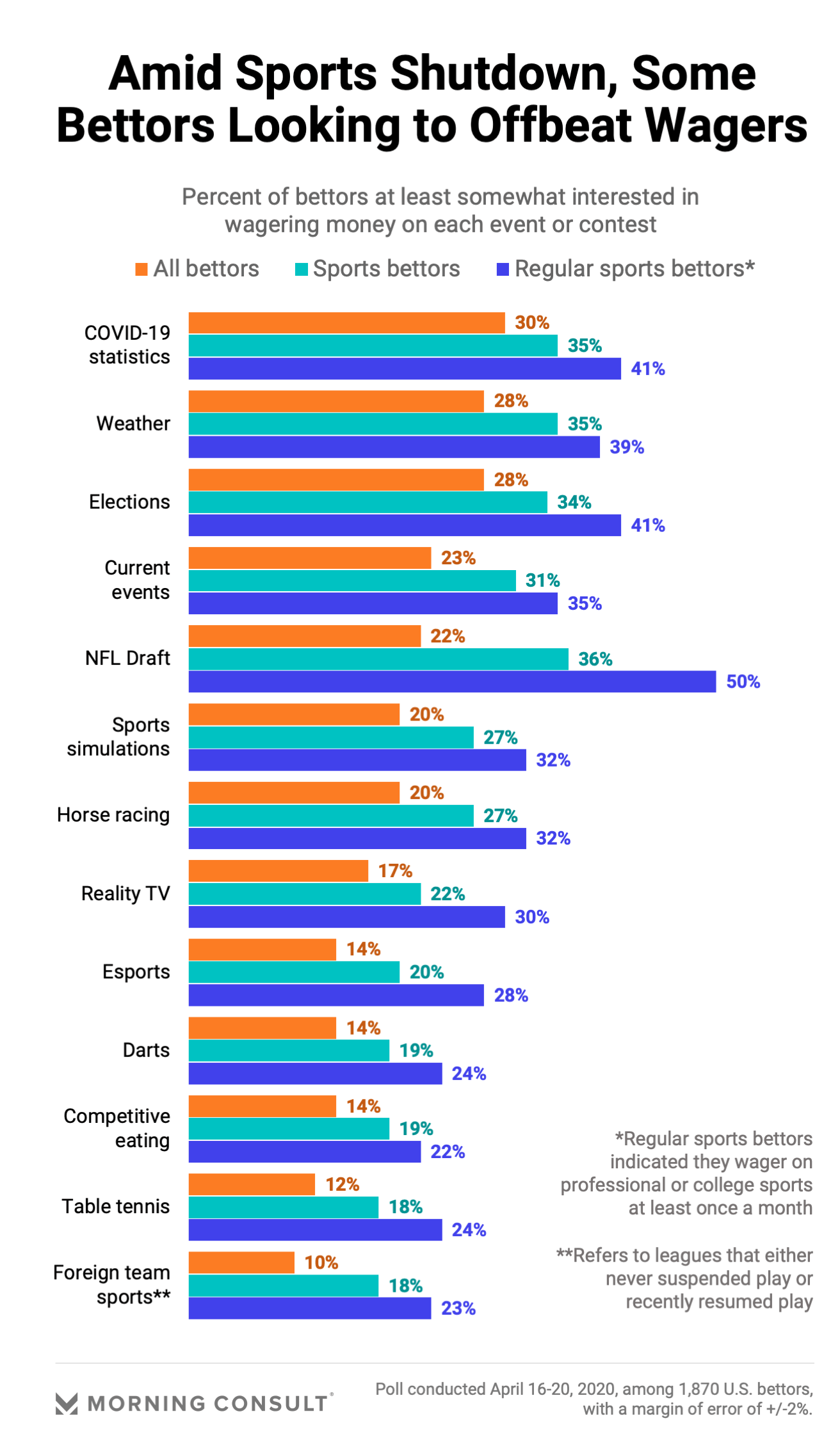 But according to a new Morning Consult survey, more than 1 in 3 sports bettors would consider gambling on what Burns considers beyond the pale. Amid the current shutdown of most major and professional college sports, 35 percent of U.S. adults who bet on sports at least occasionally would be “very” or “somewhat” interested in betting on statistics related to the COVID-19 pandemic.