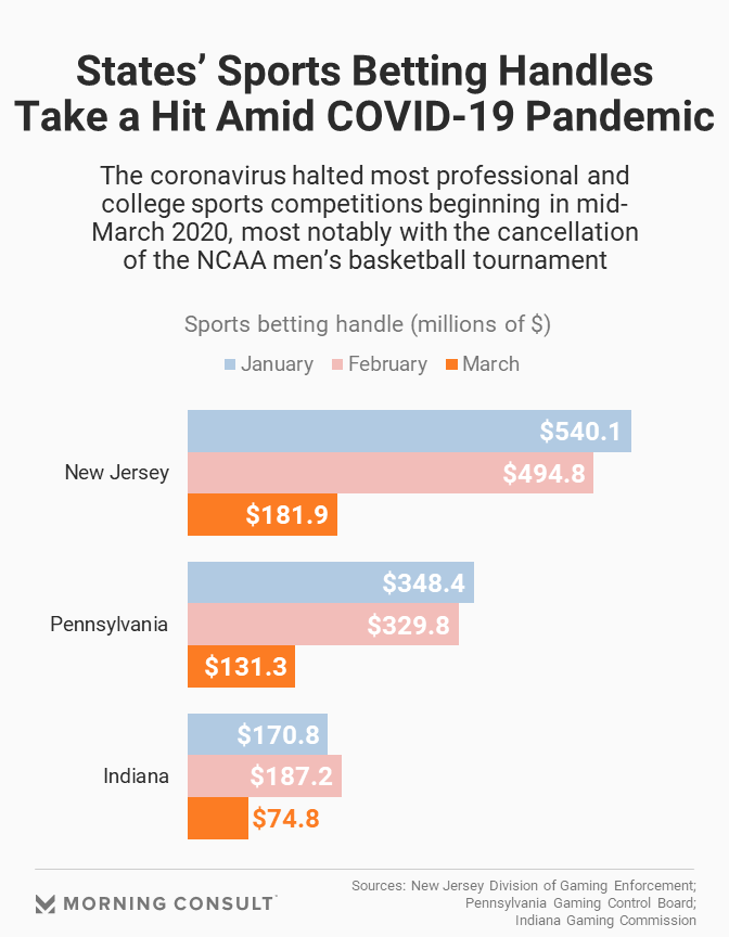 New Jersey and Pennsylvania, the states with the largest handles outside of Nevada, both saw sports betting decrease by more than 60 percent from February to March after seeing increases over the same period in 2019. Nevada has yet to release its numbers for March.