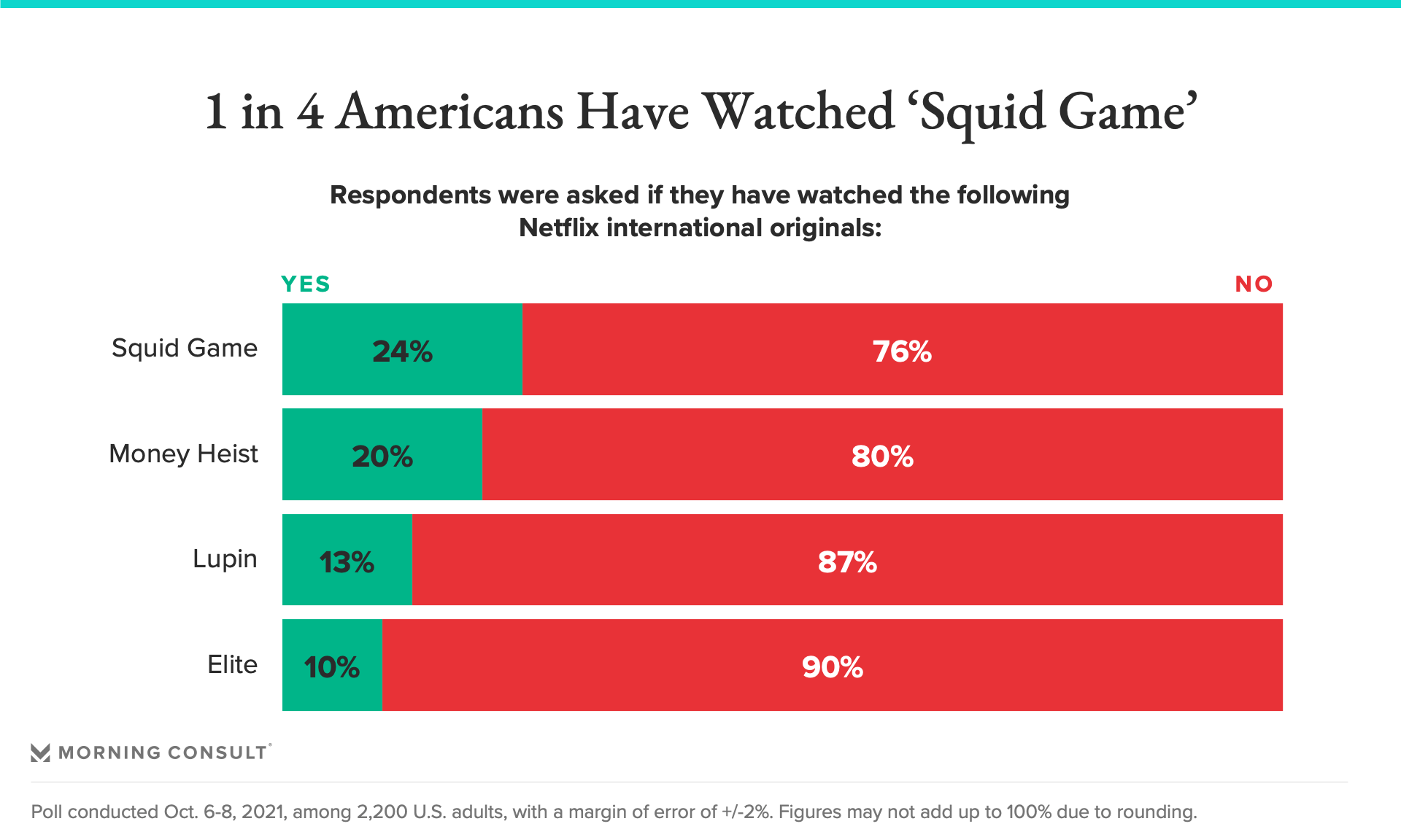 “Squid Game” is taking over the United States. According to a Morning Consult survey, roughly a quarter of Americans have seen the Korean-language Netflix drama, putting it on track to become the streaming service’s most-watched original series of all time. The show’s unprecedented popularity will likely only reinforce Netflix’s commitment to investing in content from outside the U.S.