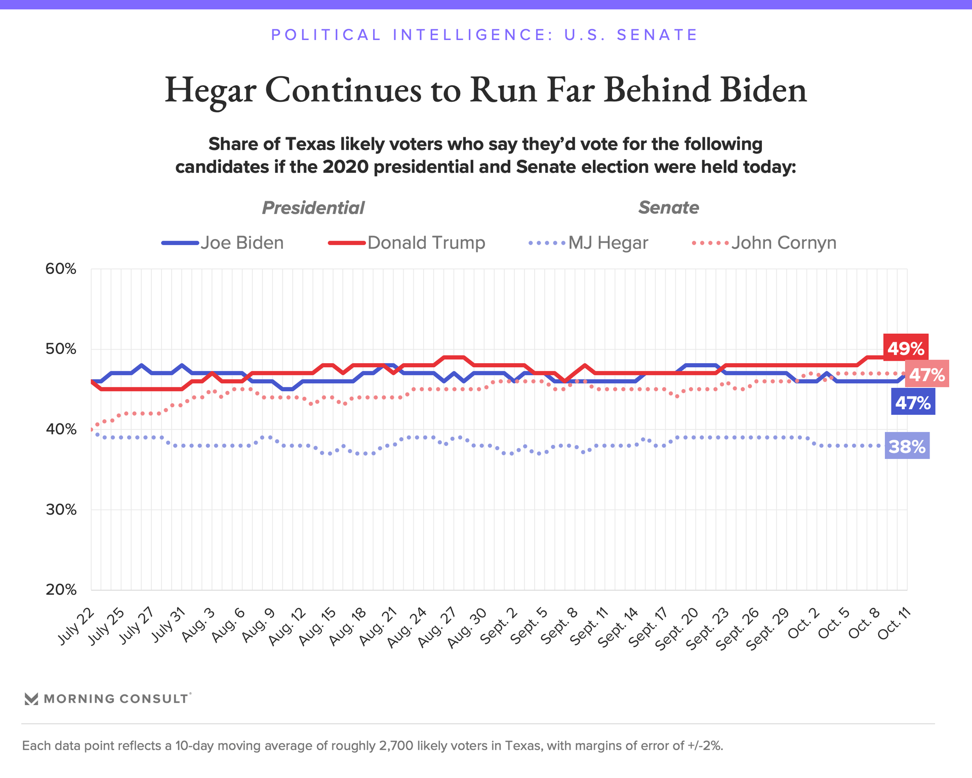 One Democratic strategist in Washington noted that the polling does not suggest a large share of Biden-Cornyn voters exist, but rather that Hegar has work to do in order to match Biden’s standing in the state and create a stronger contest in the final weeks.