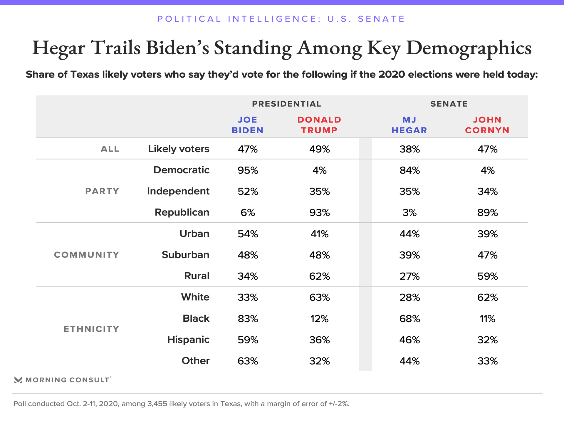 In Texas, that dynamic is flipped: As she faces off against Sen. John Cornyn, Democrat MJ Hegar has consistently underperformed Biden in the Lone Star State, driven by her relative weakness among Democrats and voters of color, according to Morning Consult Political Intelligence tracking.