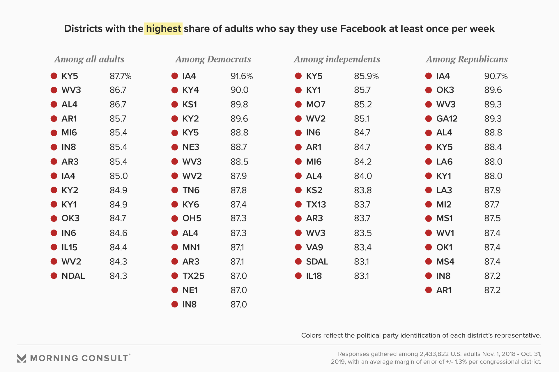 An analysis of the social media habits of 2,433,822 people around the nation, gathered from Morning Consult polls conducted from November 2018 through October 2019, shows which congressional districts have the largest share of weekly Facebook users, and thus could be the most vulnerable districts in terms of potential misinformation, whether from political ads or false news articles, during the 2020 election cycle.