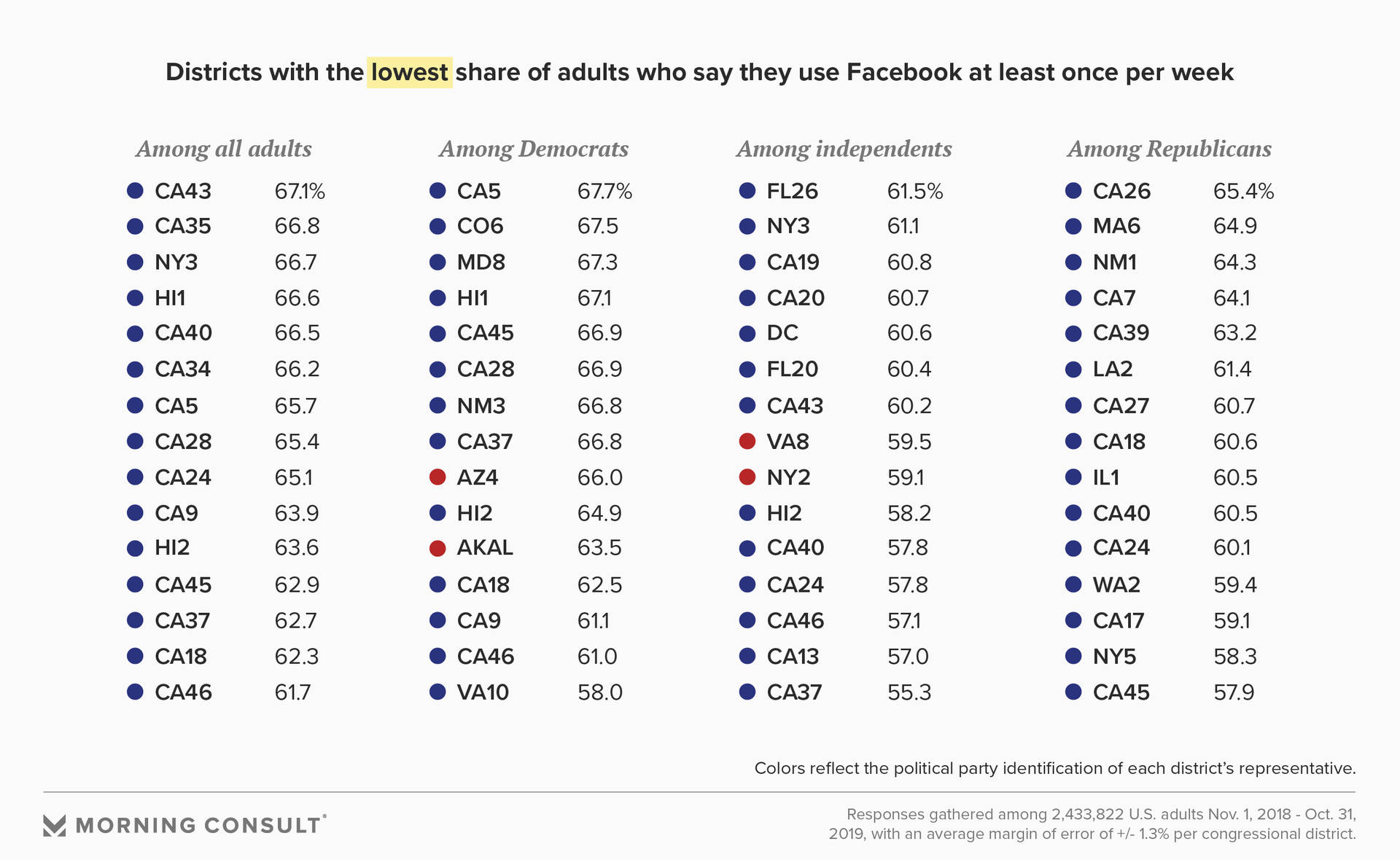 The districts with the highest share of weekly Facebook users largely have one thing in common: Their representative is Republican. That’s true for the top 15 districts, and 48 of the top 50 in terms of heavy usage.
