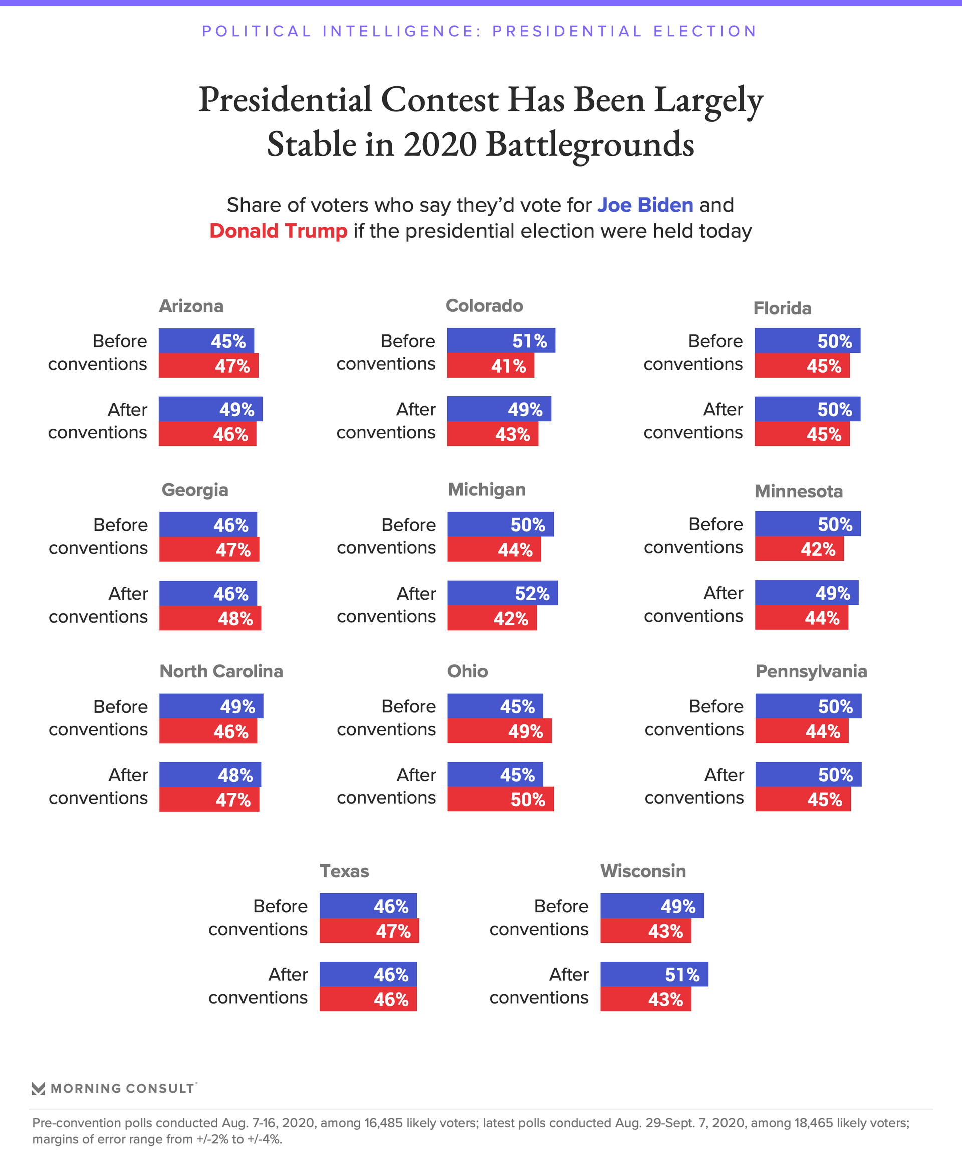 While the national race appears to be narrowing slightly, Morning Consult’s state-level polling shows a relatively stable race in battlegrounds since before the parties’ national conventions last month. Responses collected Aug. 29 through Sept. 7 -- entirely after the conclusion of the Republican National Convention on Aug. 27 -- show the race statistically unchanged in 10 states since early August. That includes Wisconsin, where Biden continues to lead, suggesting that unrest in Kenosha has done little to alter the electoral status quo.