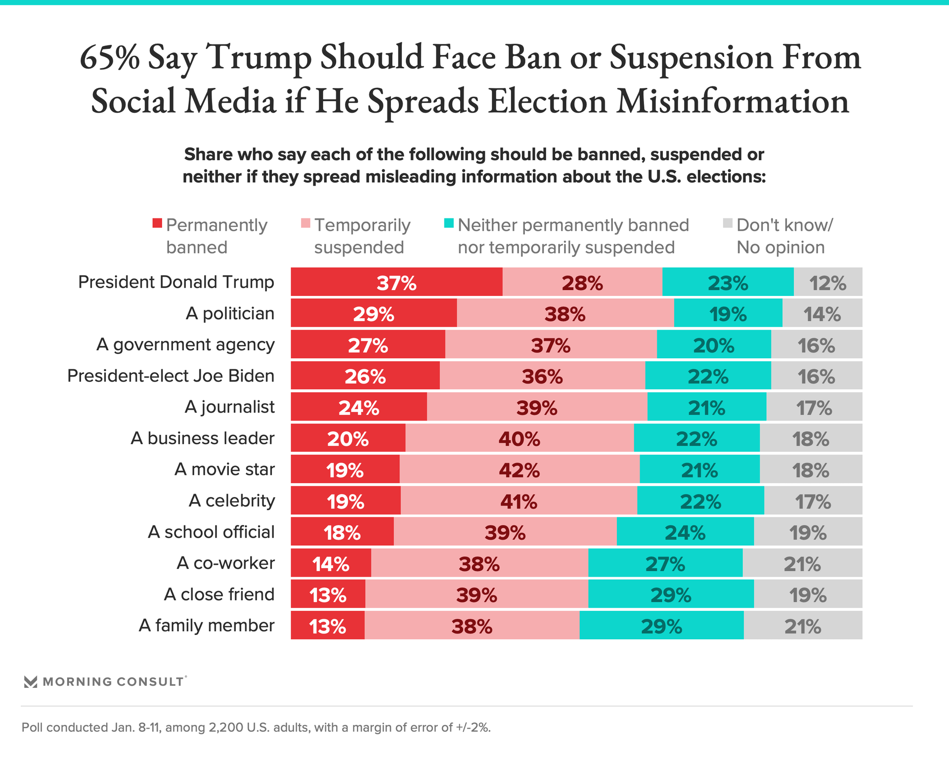 “A politician” ranked second, with 29 percent saying he or she should be banned for spreading such information.