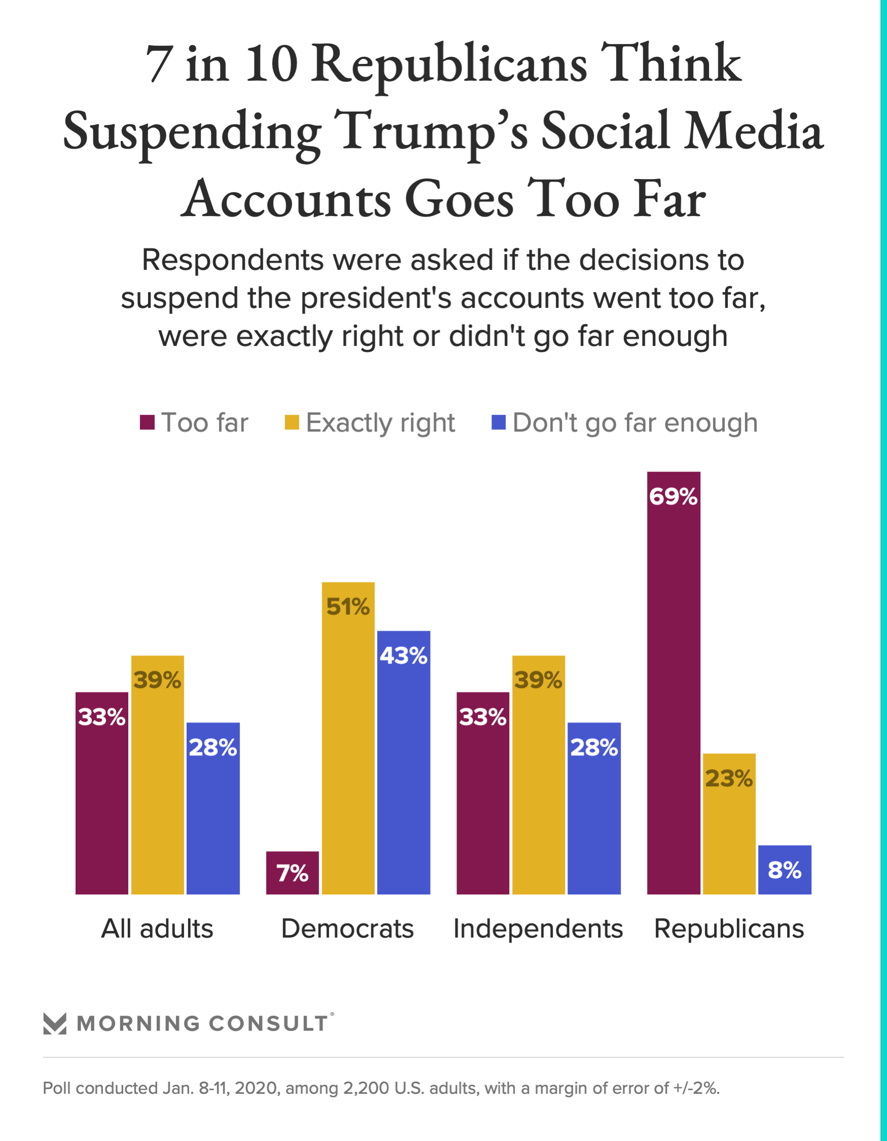 According to a new Morning Consult survey, the social media platforms appear to have the backing of a plurality of the public, with 39 percent of adults saying that moves to temporarily suspend the president to ensure a peaceful transition of power are “exactly right.”