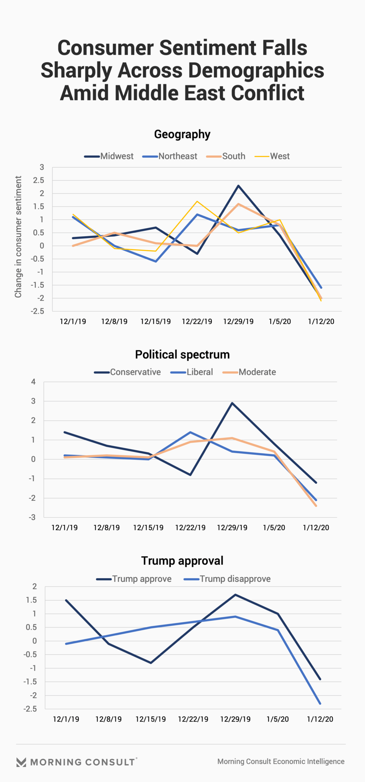 Transcending political beliefs, approval of President Donald Trump and even where one lives in the United States, consumer sentiment has dropped sharply across the board on a weekly basis since Americans learned of the U.S. strike that killed top Iranian commander Gen. Qassem Soleimani in Iraq, according to an analysis of Morning Consult Economic Intelligence data.