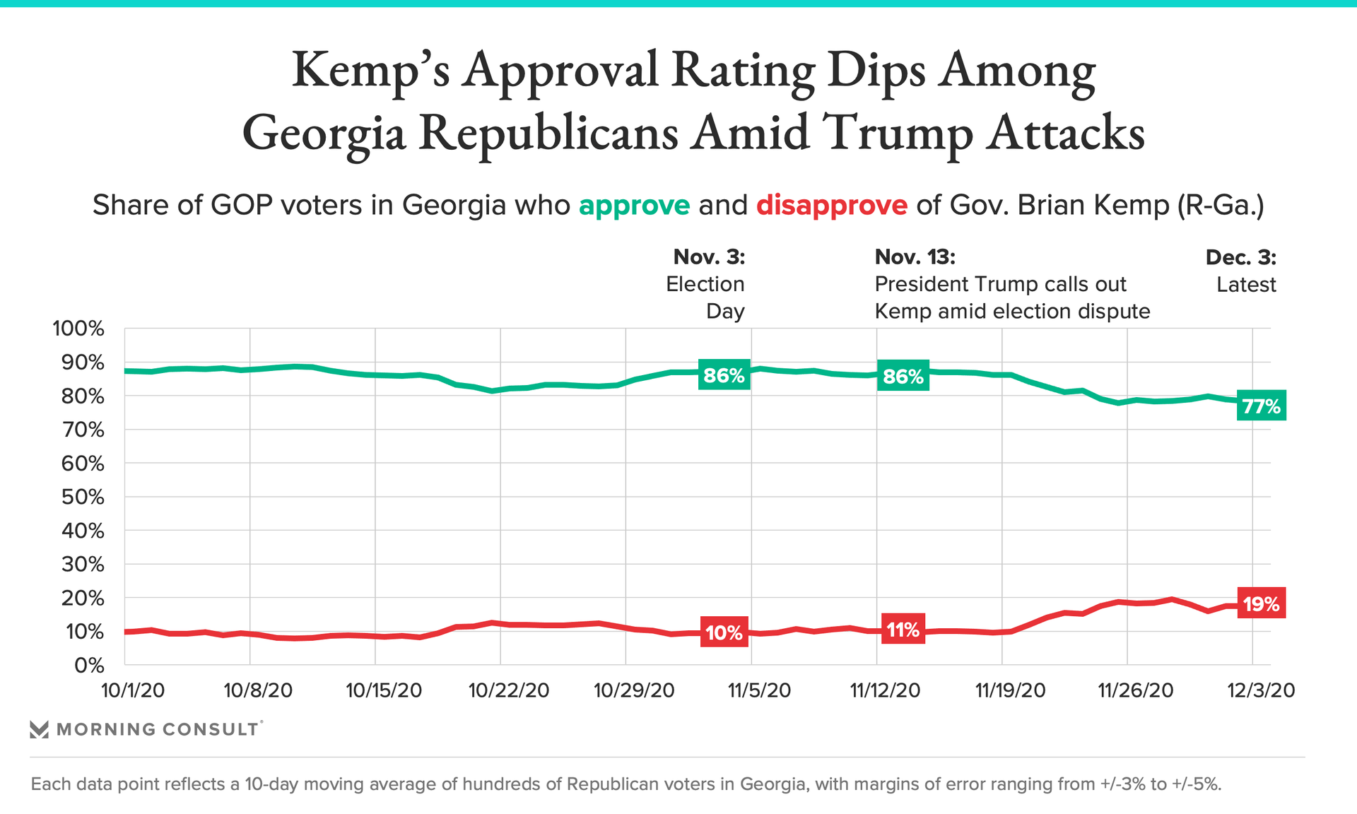 According to Morning Consult Political Intelligence’s daily tracking, Kemp’s approval rating among Republican voters in the state has fallen from 86 percent to 77 percent since Election Day on Nov. 3. The first-term governor’s disapproval rating nearly doubled, from 10 percent to 19 percent in the latest polling, conducted Nov. 24 to Dec. 3 among 551 registered GOP voters in Georgia, with a margin of error of 4 percentage points.