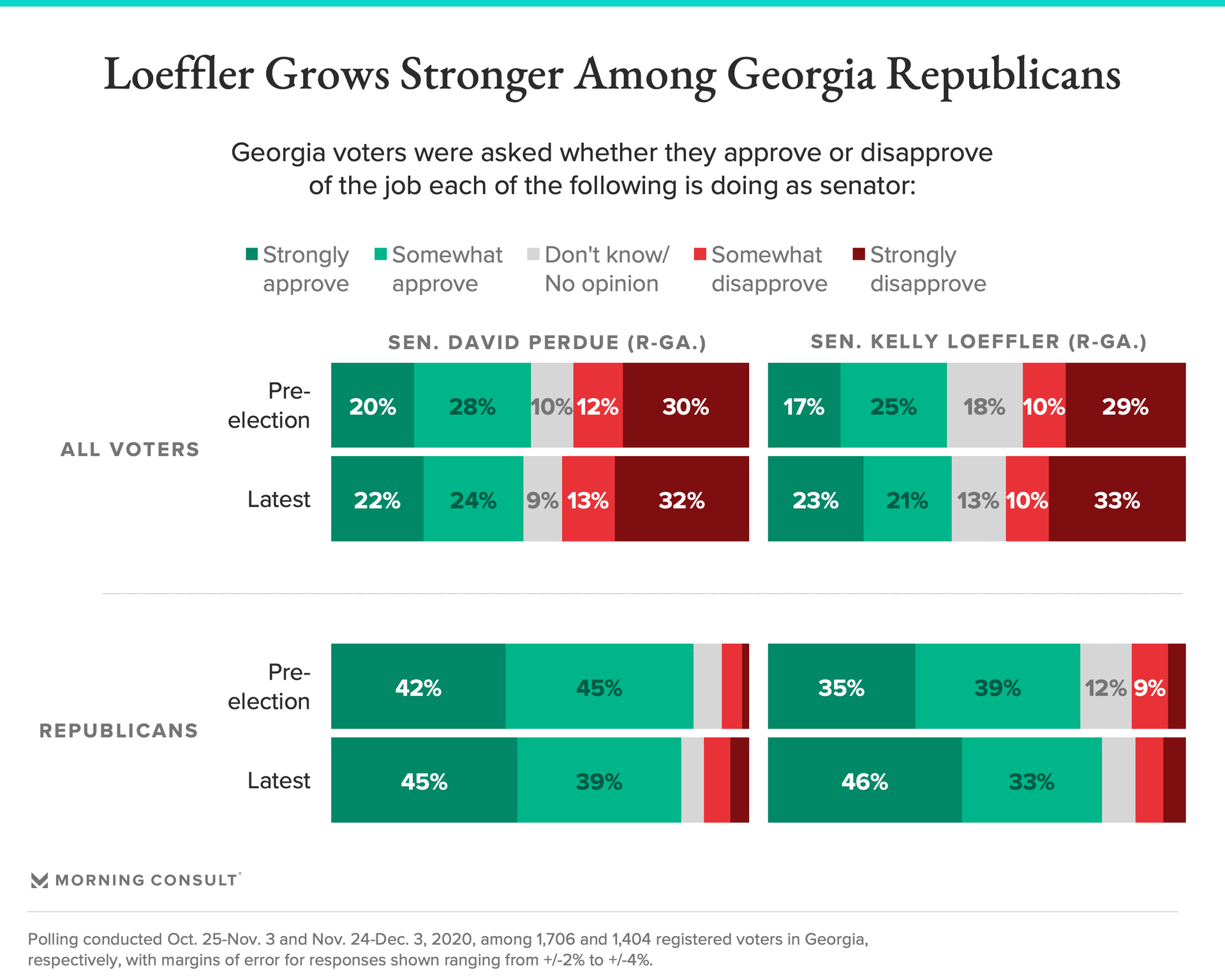 When it comes to Republican voters, 84 percent approve of Perdue and 79 percent approve of Loeffler. But since the election, Loeffler has seen a strengthening in the base: 46 percent of Republicans approve of her strongly, up 11 points and roughly matching Perdue’s placement on the metric (45 percent).