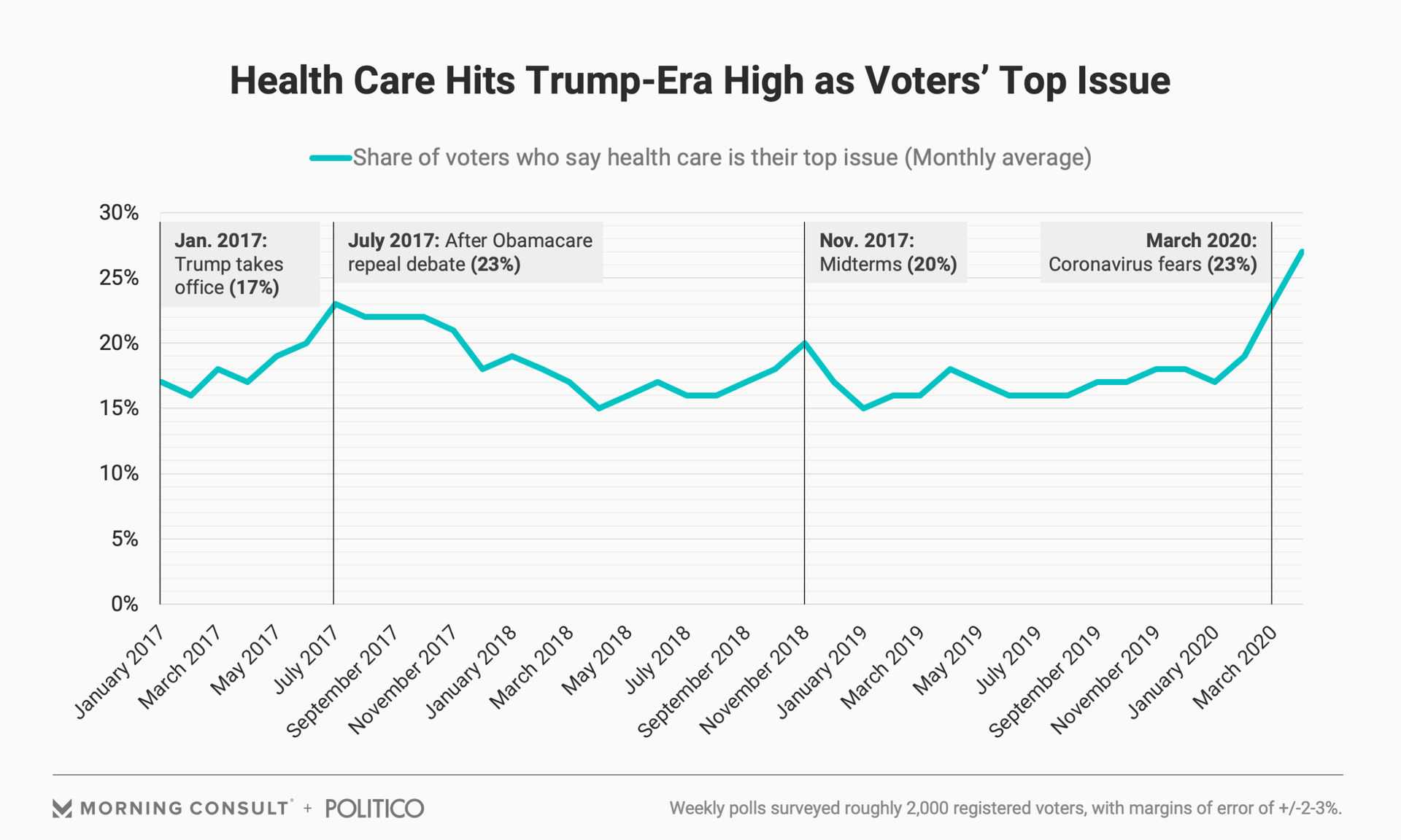 Already, since the pandemic captured voters’ minds in early March, the share of voters who said health care was their top issue has increased to the highest monthly average of Trump’s presidency since July 2017. The latest poll found 27 percent of voters said health care was their top issue when thinking about their vote.