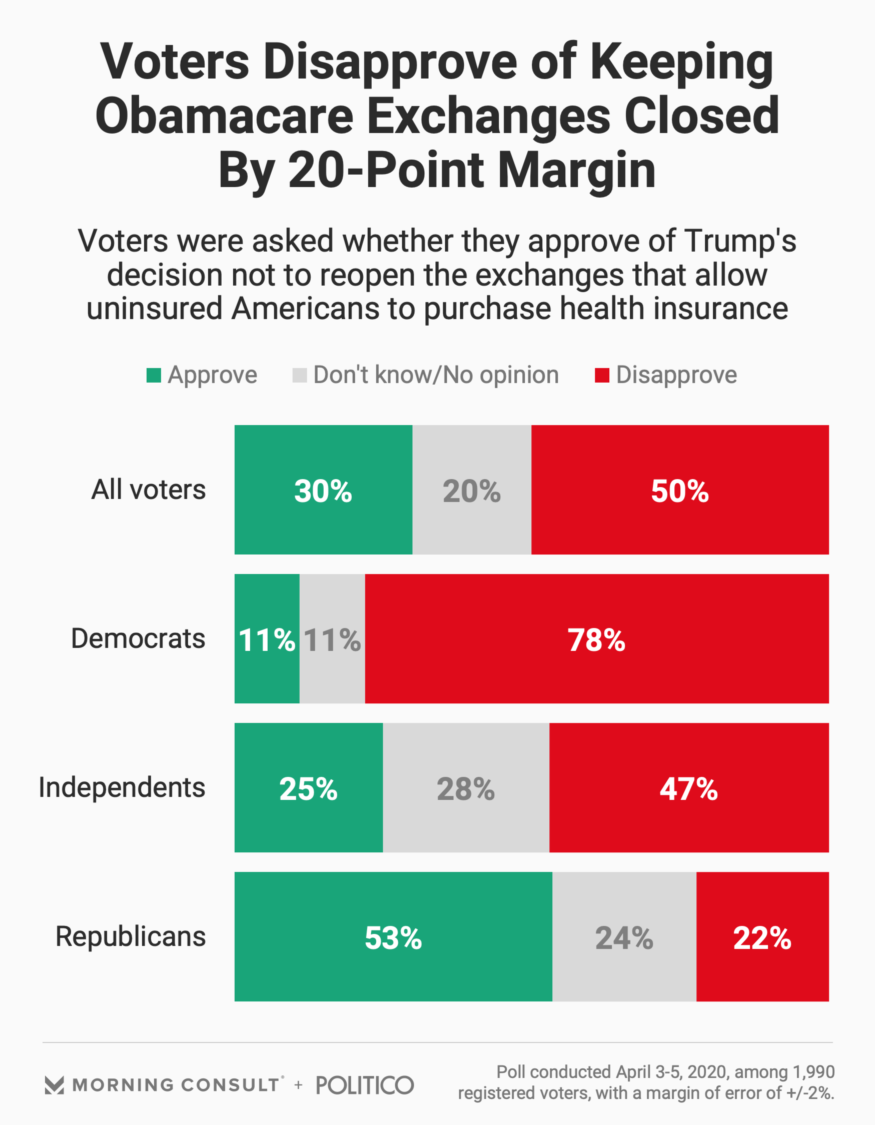 A new Morning Consult/Politico poll found half of registered voters disapprove of President Donald Trump’s decision not to reopen the Affordable Care Act’s HealthCare.gov portal for a special enrollment period, while 30 percent approve. Fifty-three percent of Republican voters approve of Trump’s move, but 22 percent disapprove. Independent voters disapprove of the decision by a margin of 22 percentage points, while Democrats disapprove by a 67-point margin.