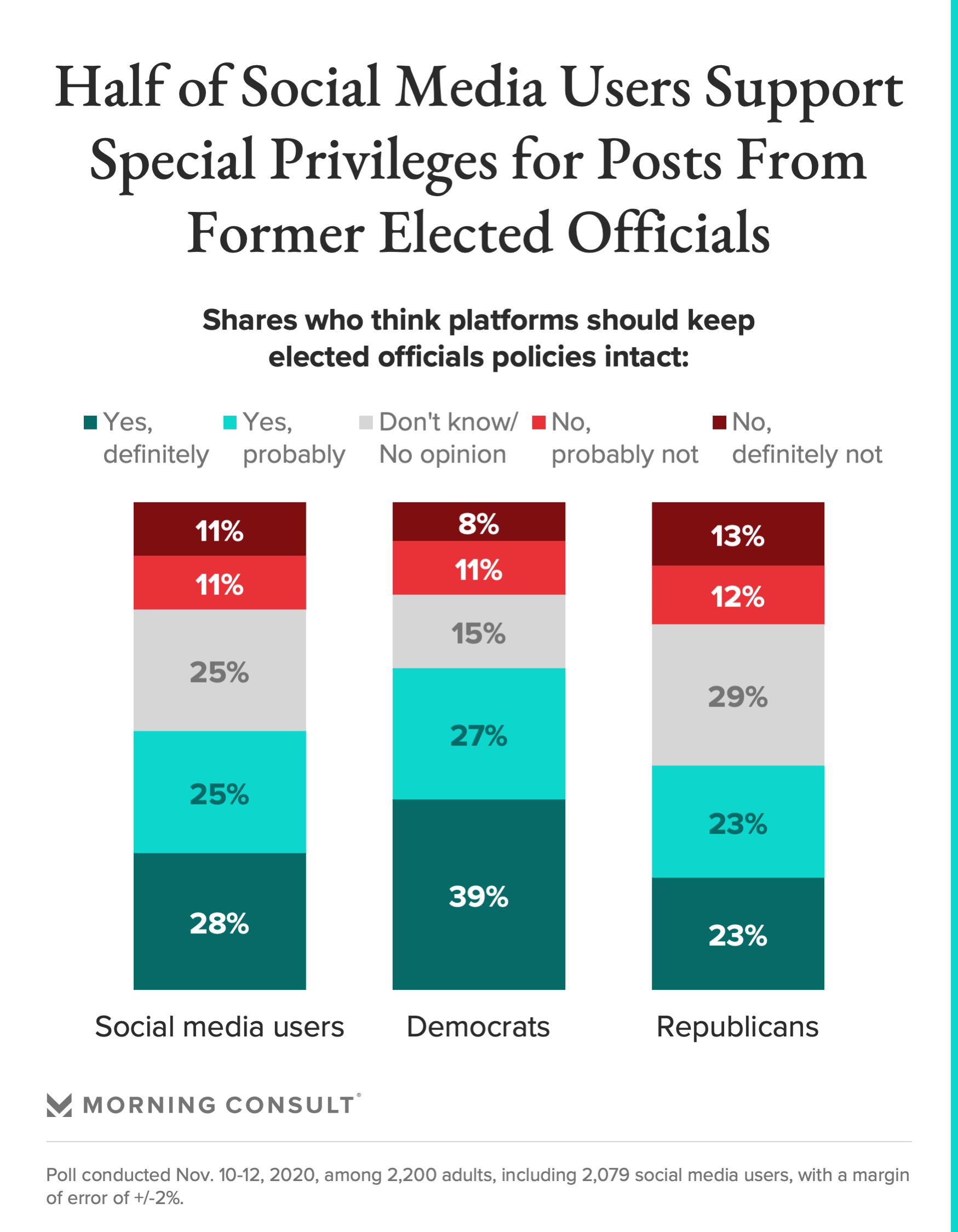 According to the survey conducted Nov. 10-12 among 2,079 social media users, 53 percent said special policies for moderating social media posts from elected officials, such as the sitting president or other heads of state, should “definitely” or “probably” apply to those same accounts once the official leaves office. Another 25 percent said they were unsure or didn’t have an opinion.