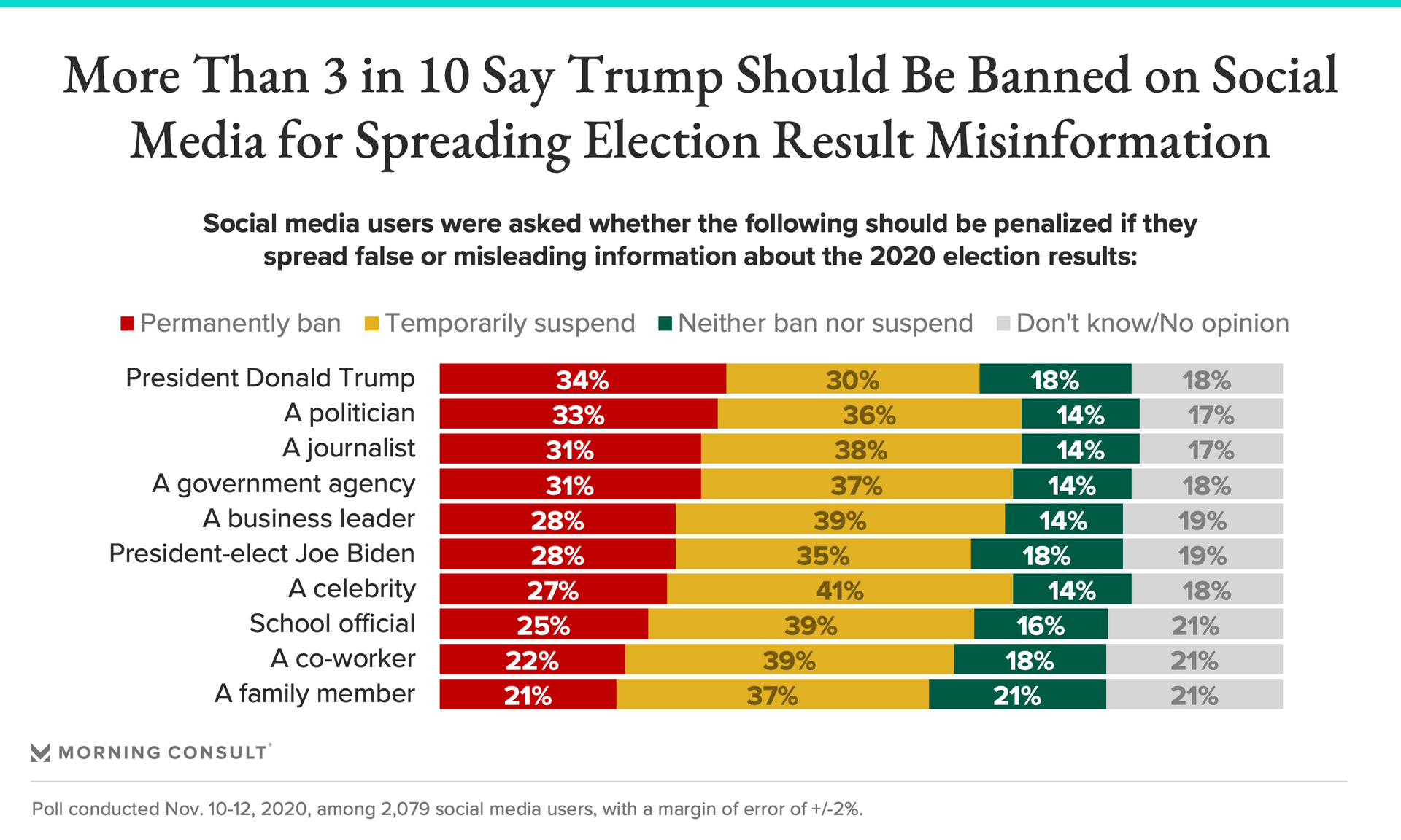 34% of social media users said Trump should be banned from platforms whenever he shares disinformation about the election results -- the highest share among the list of figures included in the survey.