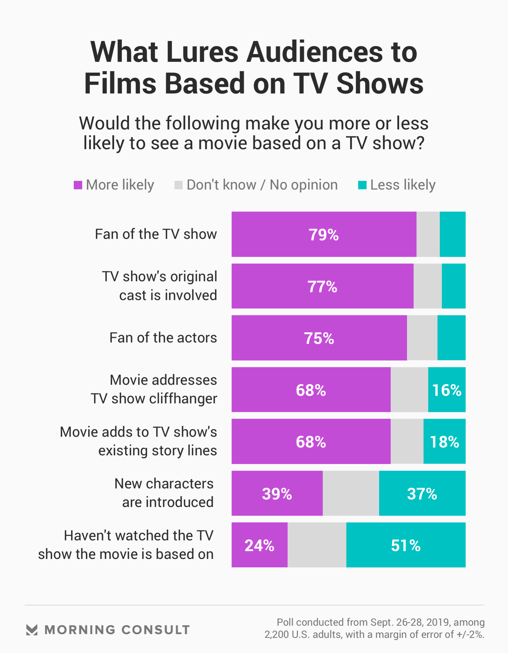 When it comes to drawing audiences, 7 in 10 respondents said they’d be more likely to see a film based on a TV show if they’d seen the original program, while 77 percent said the same if it included the show’s original cast. And 68 percent said they’d be more likely to see the film if it contributed to existing storylines or resolved cliffhangers from the original show. The poll’s margin of error is 2 percentage points.