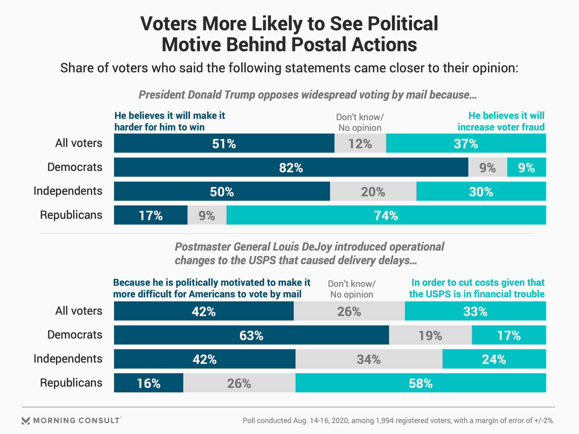 A new Morning Consult poll found 51 percent of voters said they think Trump opposes mail-in voting because he believes it will make it harder for him to win re-election. Additionally, a 42 percent plurality of voters believe the operational changes implemented in recent months by Postmaster General Louis DeJoy are politically motivated and designed to make it harder for Americans to vote by mail. The Aug. 14-16 poll, which surveyed 1,994 registered voters, has a margin of error of 2 percentage points.