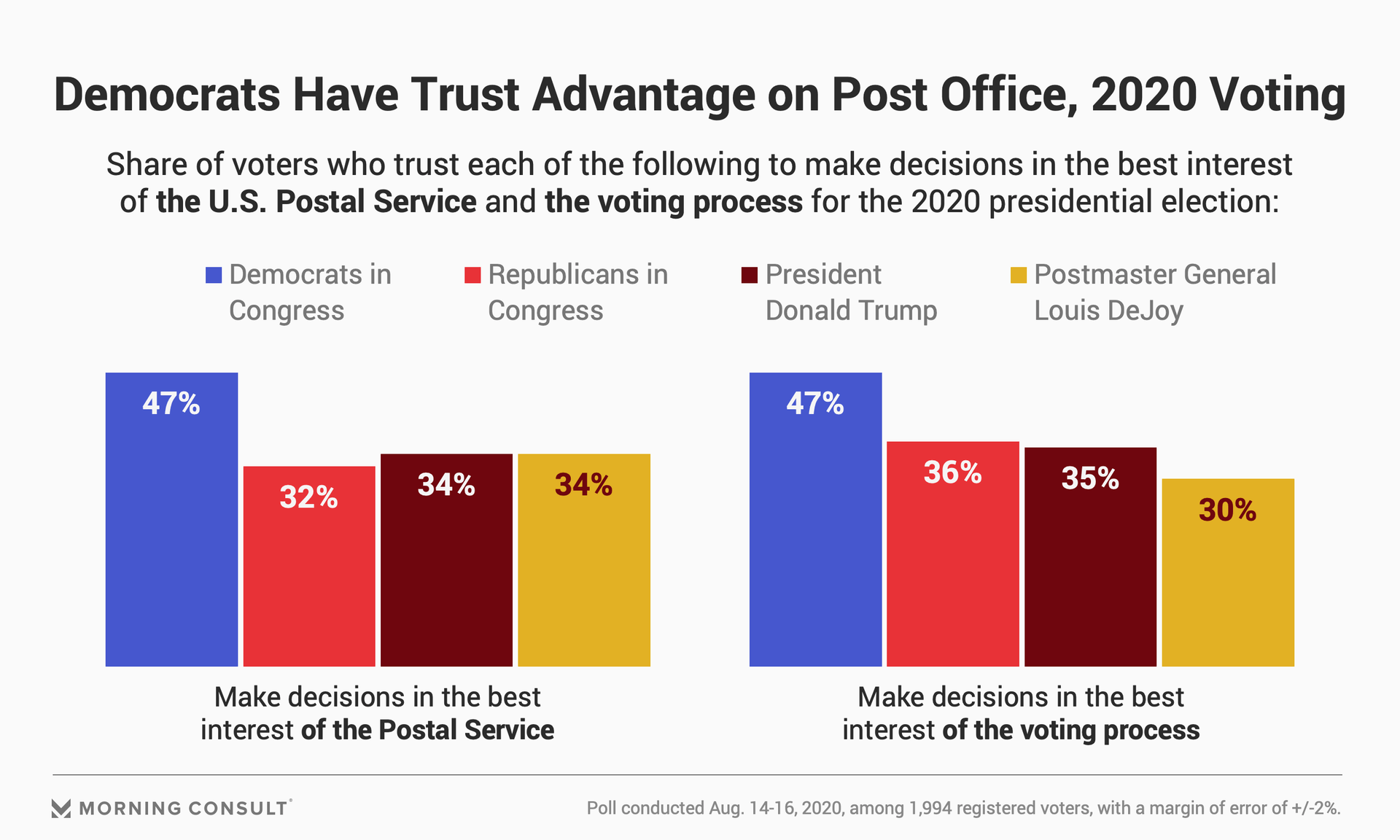 The survey finds congressional Democrats are most trusted by voters on the postal issues: 47 percent trust them to make decisions in the best interest of the Postal Service, a double-digit advantage over Trump, DeJoy and Republicans on Capitol Hill. Similar margins appeared when voters were asked how much they trust the Washington figures to make decisions in the best interest of the voting process for the 2020 presidential election.