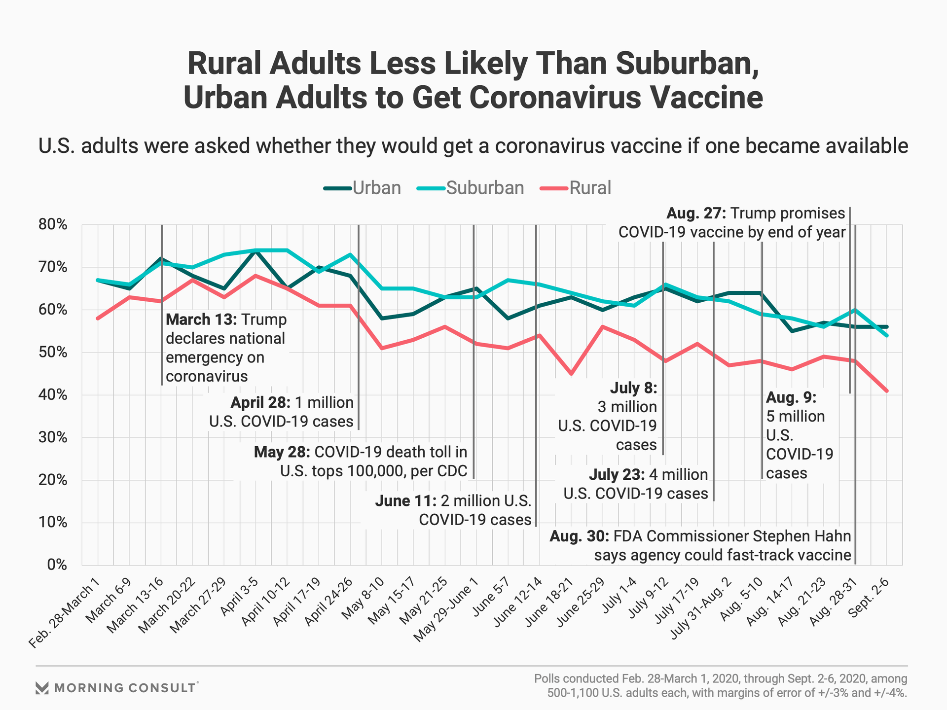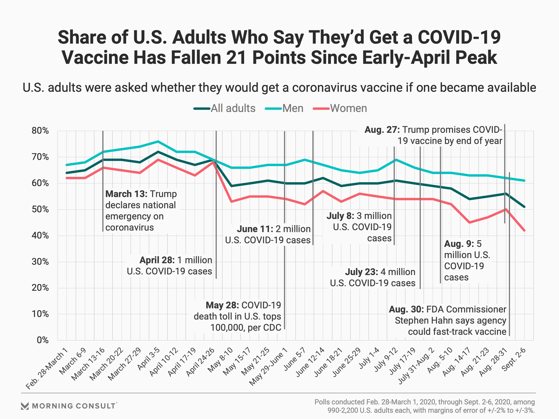 Fifty-one percent of U.S. adults now say in a Sept. 2-6 poll that they would get a COVID-19 vaccination if one became available, representing a decline of 21 percentage points over the past five months. This includes double-digit decreases among men, women, Democrats, Republicans, independents, residents of urban, suburban and rural environments and respondents of all levels of education.
