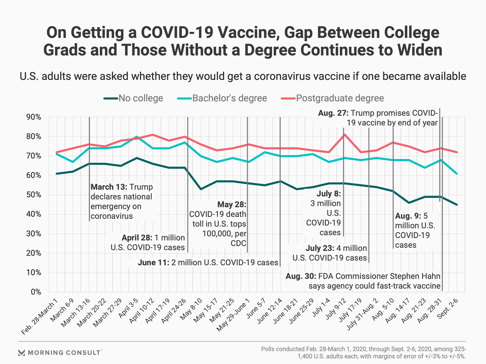 But the share of people willing to get the vaccine never rose above 72 percent. What followed that across-the-board rise in public support for inoculation has been a starker drop, even as the number of U.S. coronavirus-related deaths near 200,000 and the number of cases surpass 6 million.