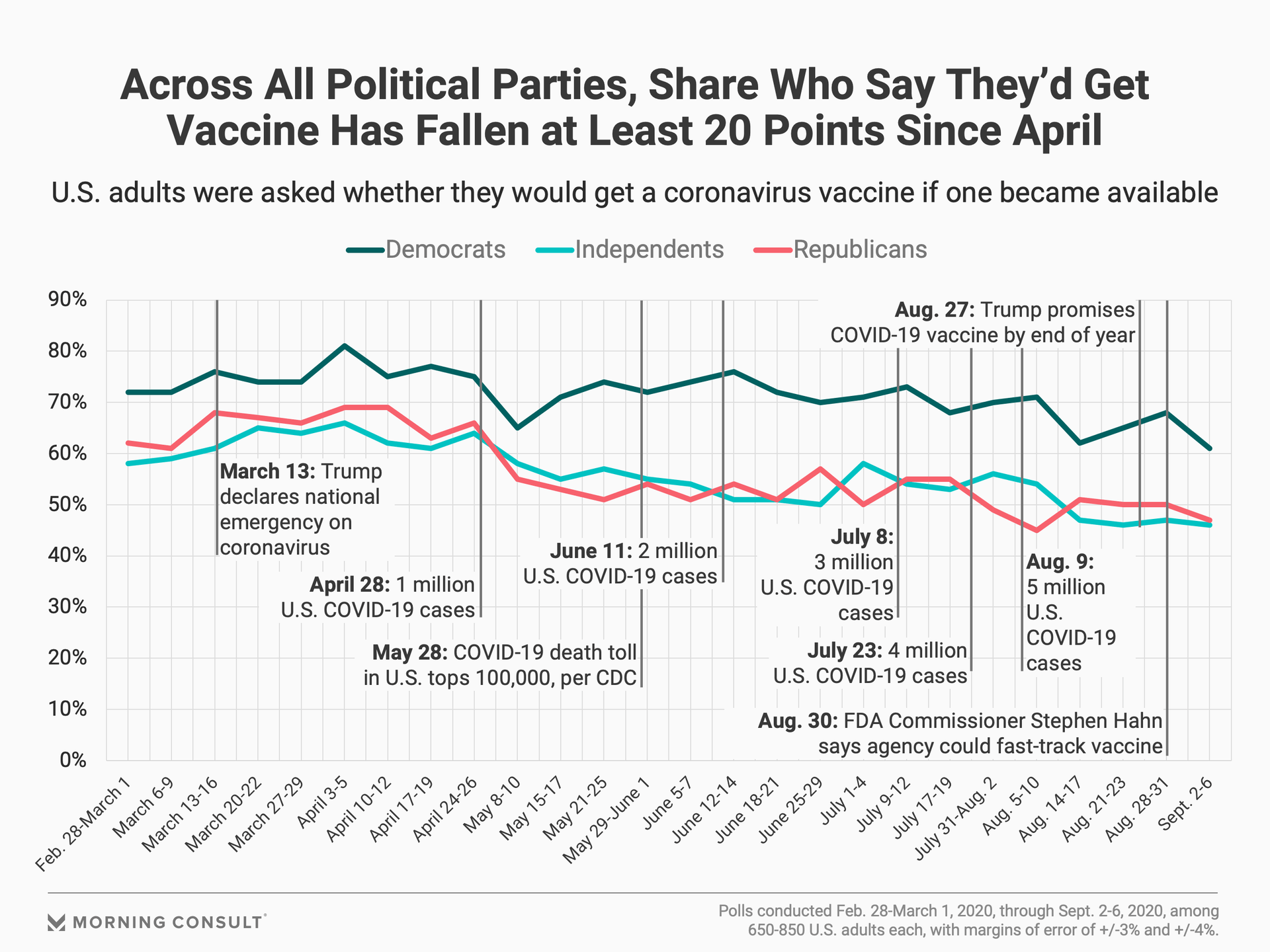 47% of Republicans say they’d get a coronavirus vaccine, a decline of 22 points over the same period, while the share of Democrats who said the same dropped 20 points to 61%.