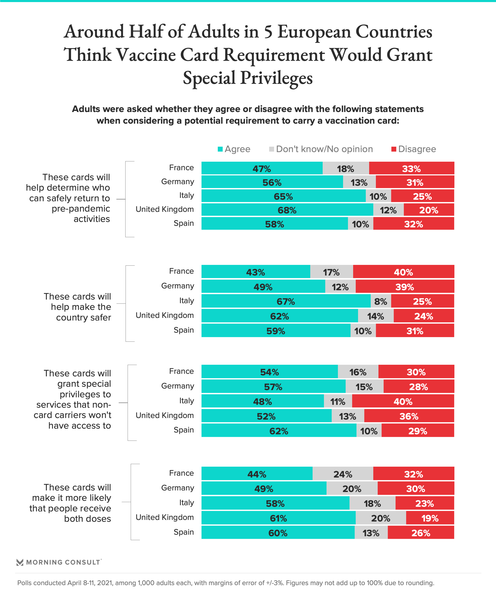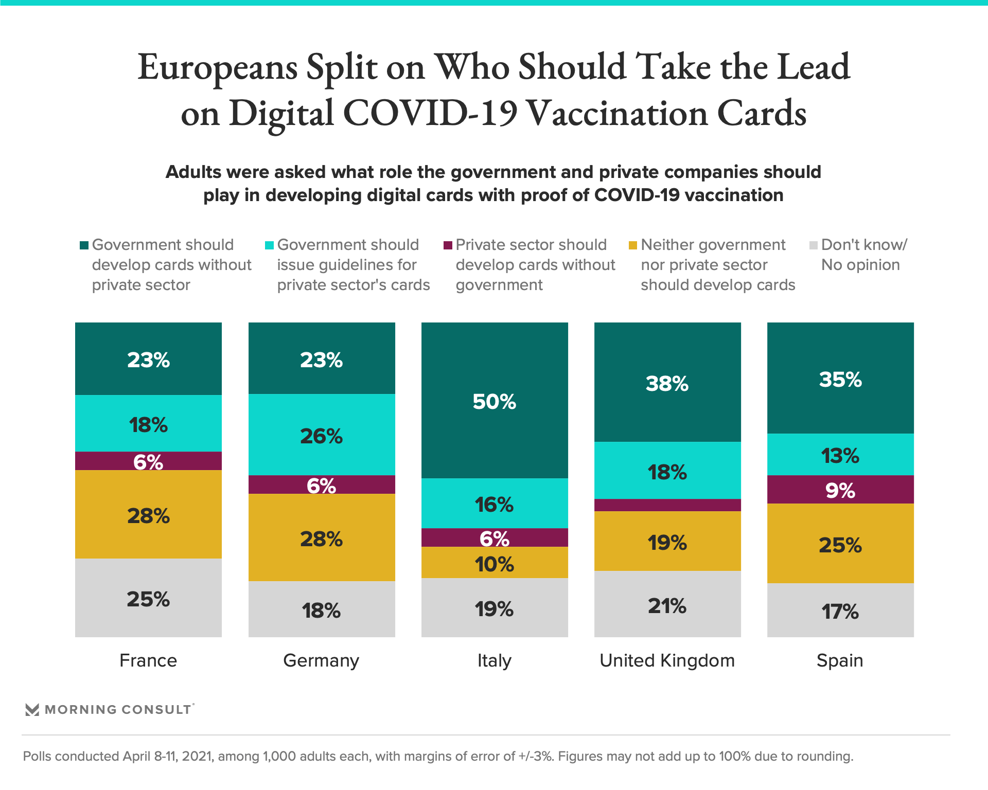 As COVID-19 vaccinations ramp up and countries around the globe grapple with how to safely relax restrictions and reopen their borders, a new Morning Consult survey conducted in five European countries finds most residents are in favor of giving people digital certificates proving their vaccination status, but they’re split on what purpose they think the cards should serve.