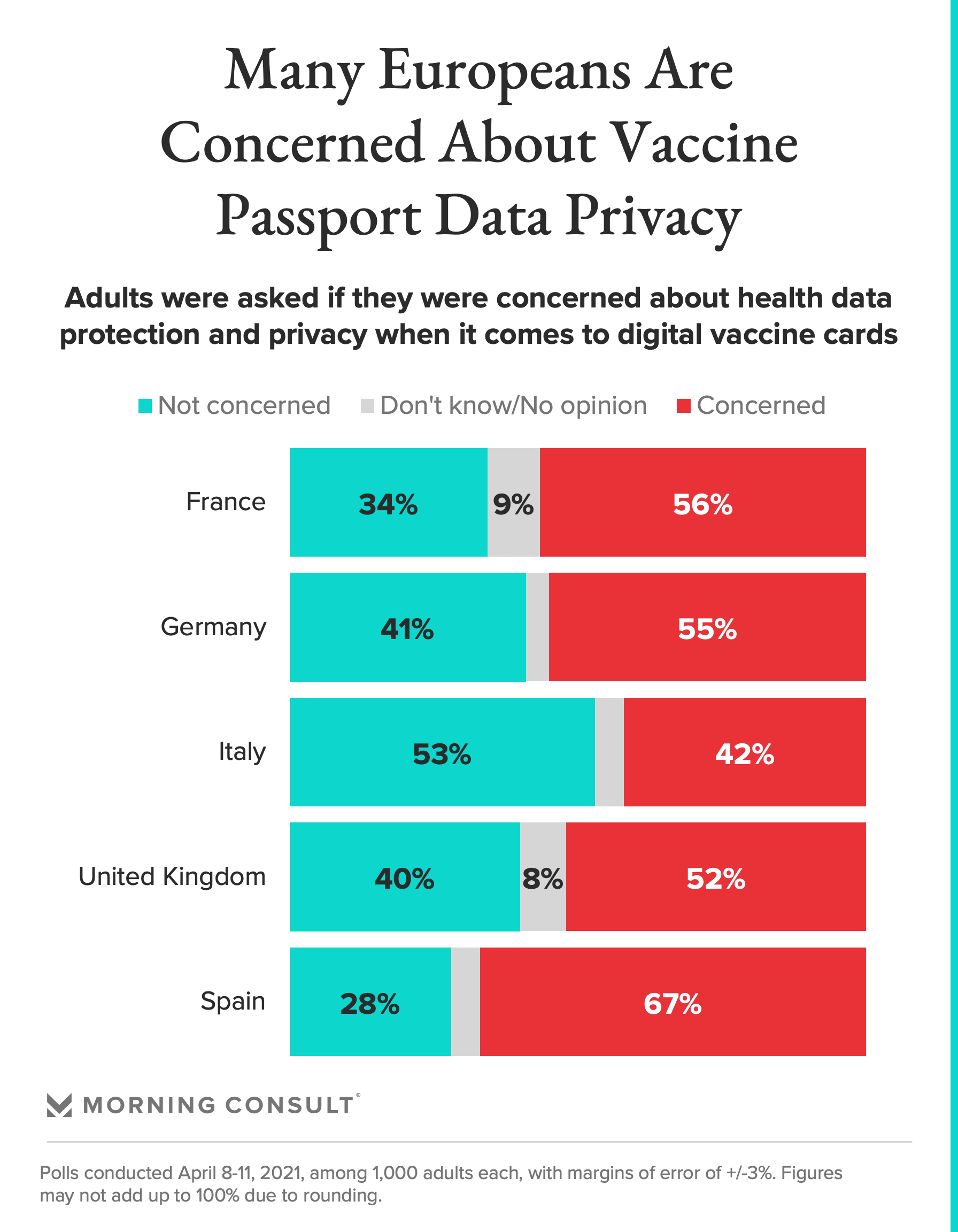 Europeans also held varying opinions about who should be involved with creating vaccine passports, if at all. Italian adults were the most likely to say the government should develop digital vaccination certificates without input from private companies, at 50 percent, and the least likely to say they were concerned about health data privacy and protection, at 42 percent.