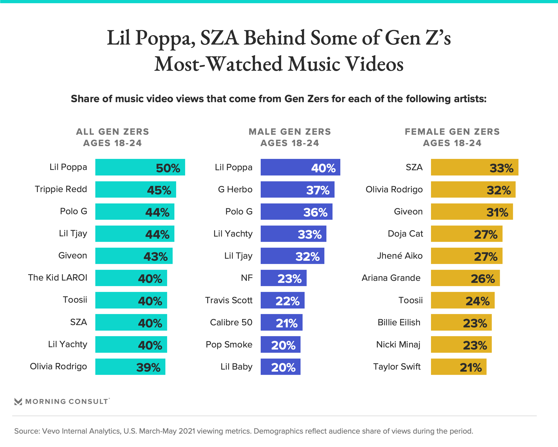 Per data from Vevo’s Internal Analytics collected between March and May of this year, certain artists over-indexed among Gen Z adults, with a large share of their music video views coming from those ages 18-24. Rapper Lil Poppa topped the list among that demographic, with half of his music video views coming from the demographic.