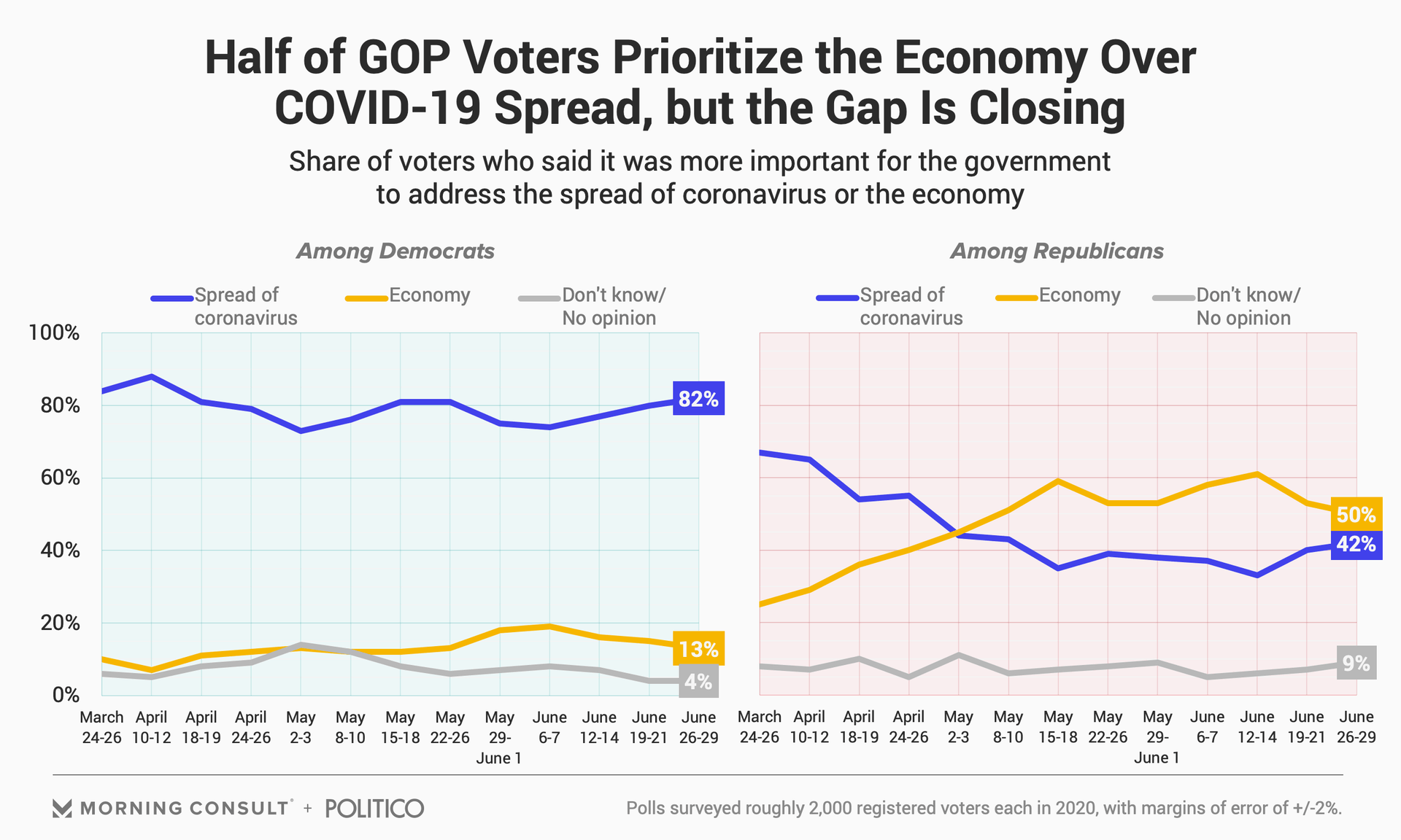 Over the course of two weeks, the share of voters who said it’s more important for the government to address the spread of coronavirus increased 8 points, to 63 percent, while the share who said it was pivotal to address the economy fell 7 points, to 29 percent, driven by a double-digit swing among Republican voters. Forty-two percent of Republicans said it’s more important for the government to address the spread of coronavirus than the economy, the highest point since polling conducted in the second week of May.